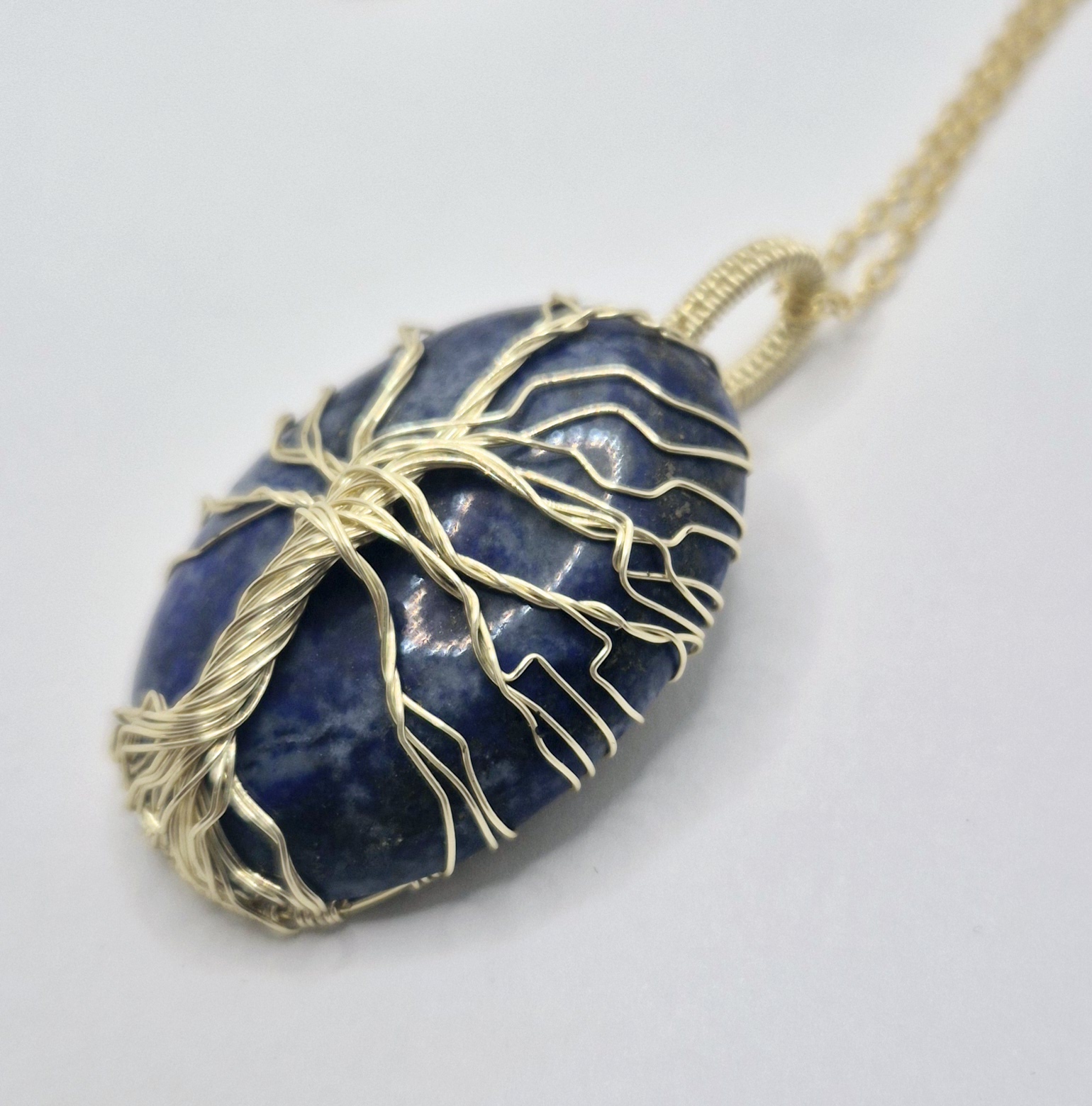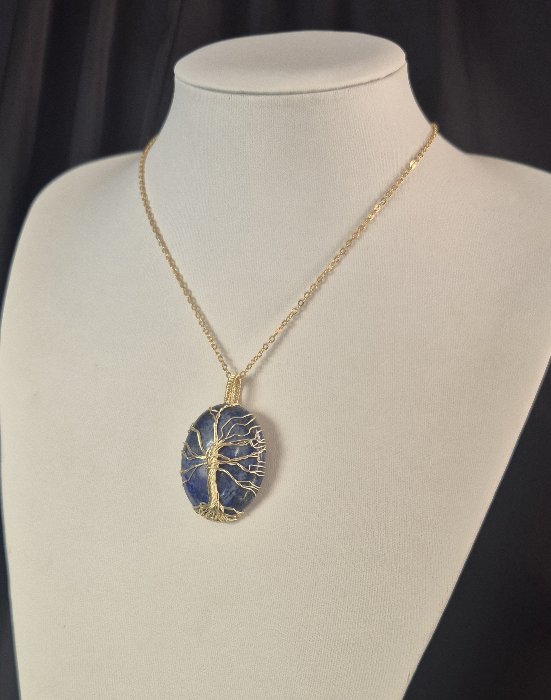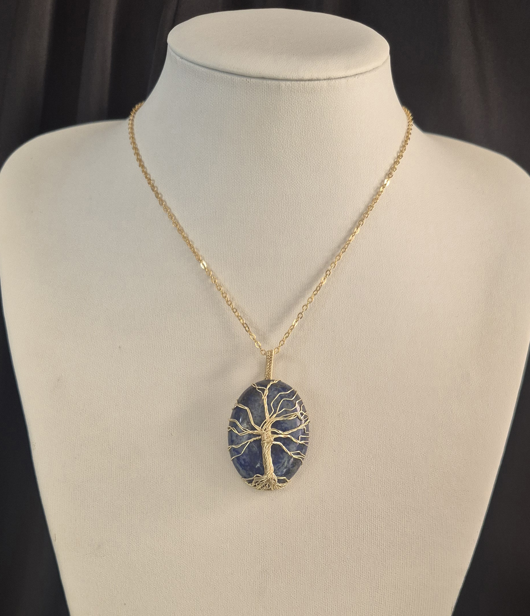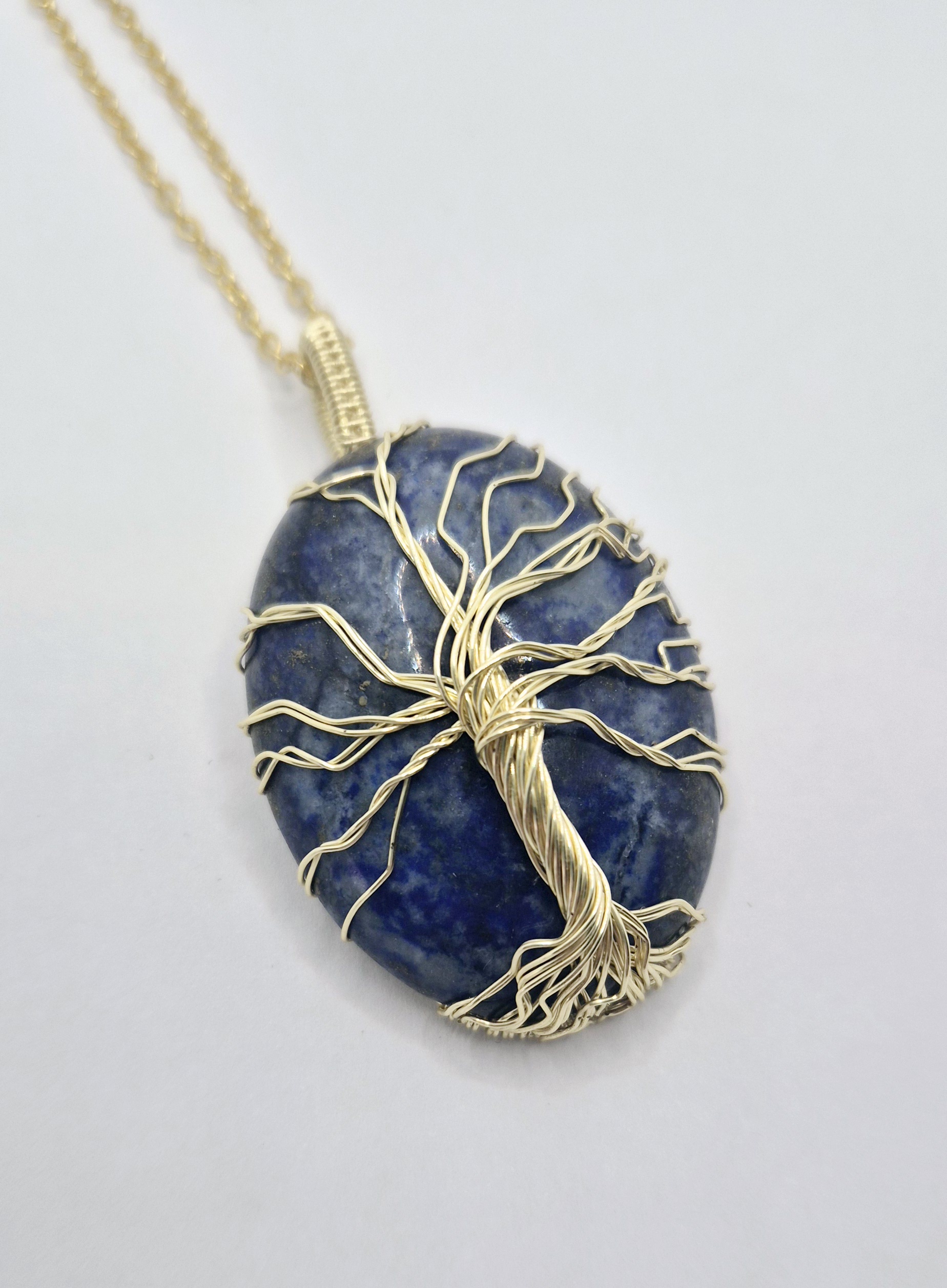 This gorgeous oval shaped Lapis Lazuli cabochon is wrapped in a gold plated ‘Tree of Life’ wire design. This one of a kind pendant measures approximately 5cm in length and approximately 3cm wide.