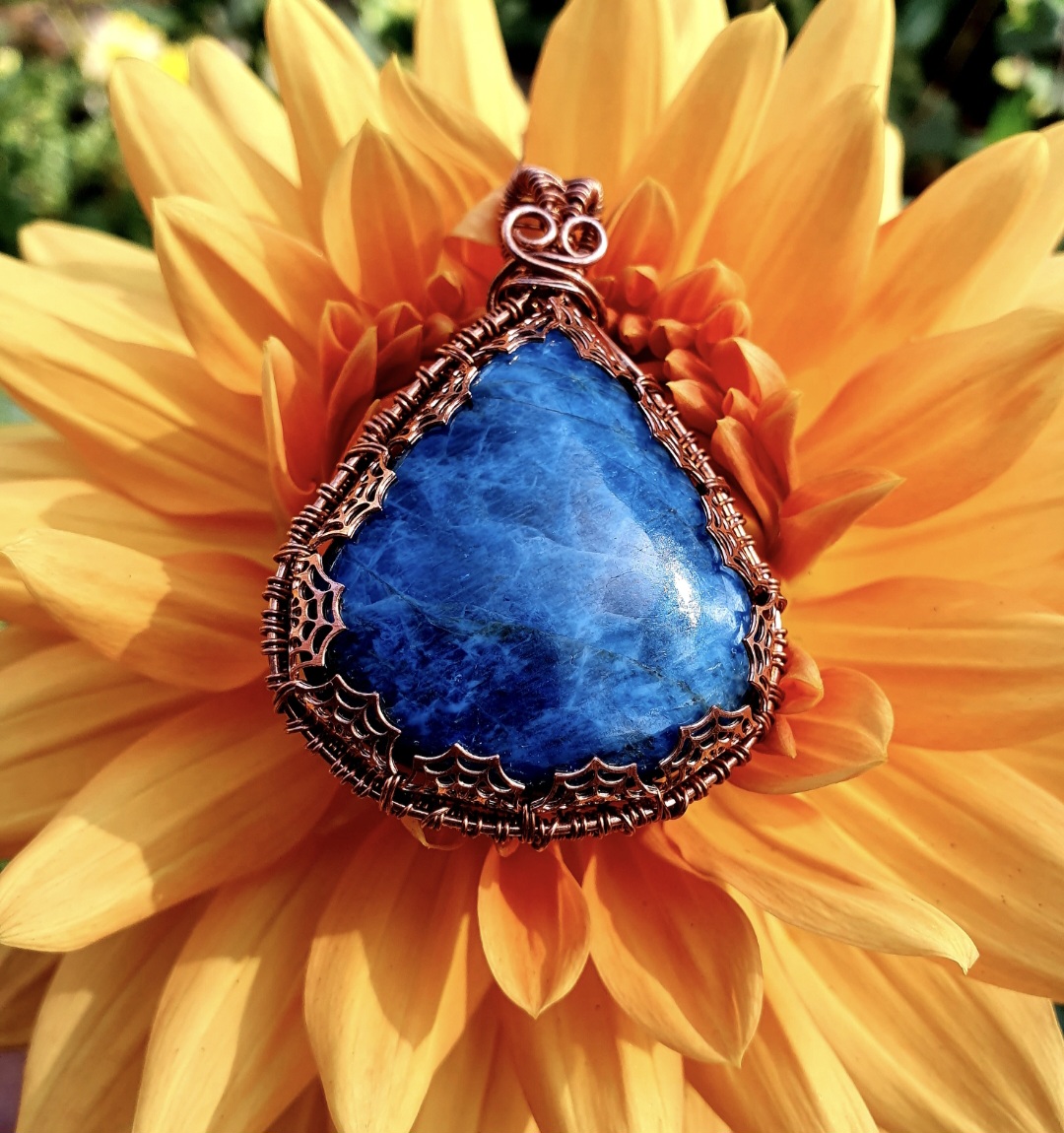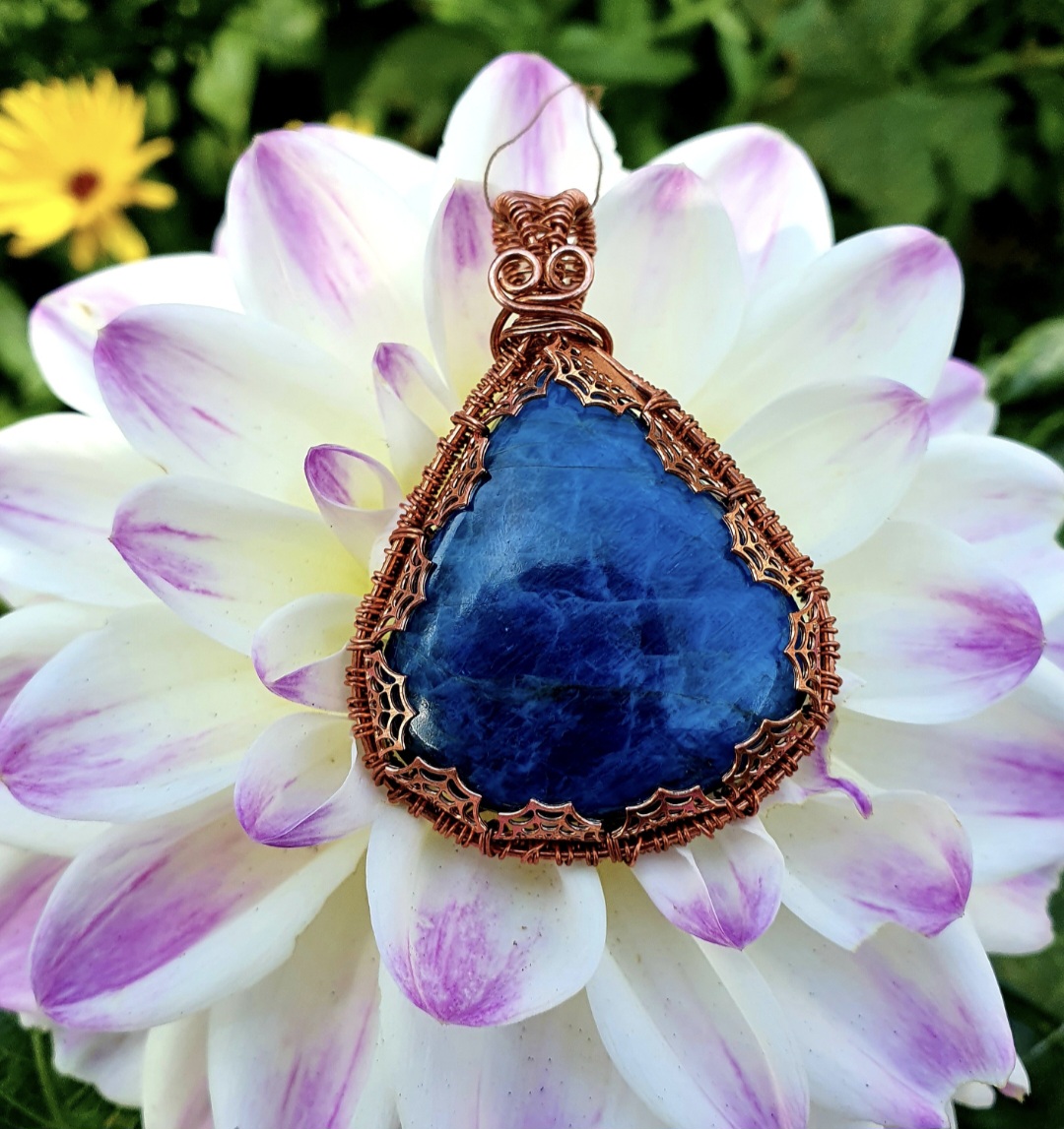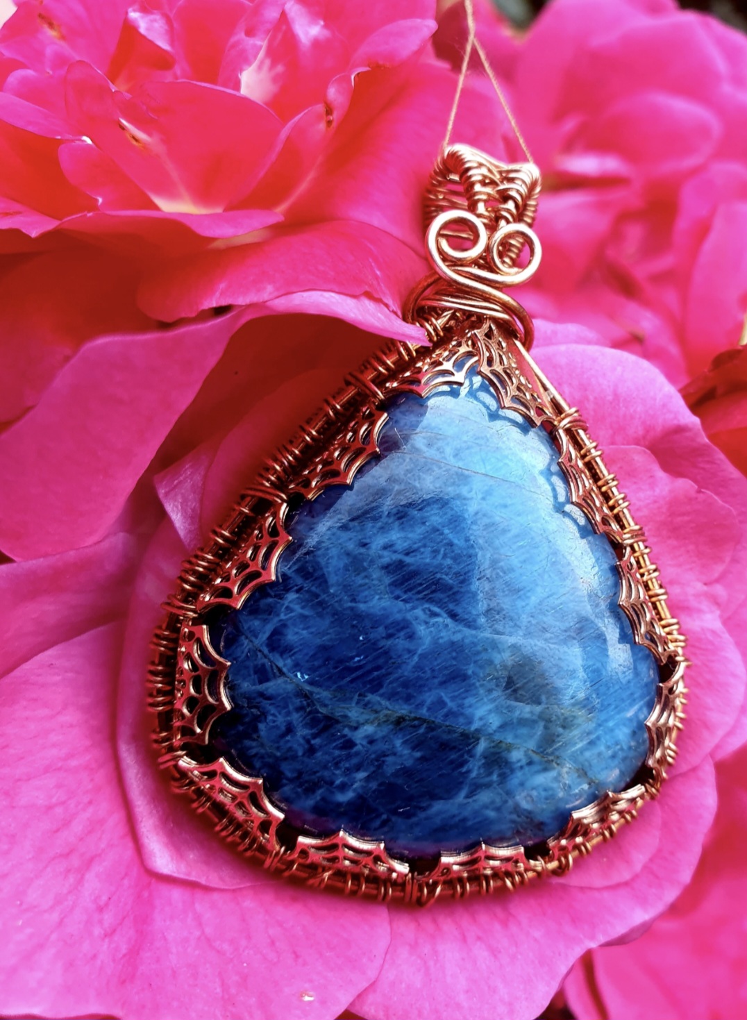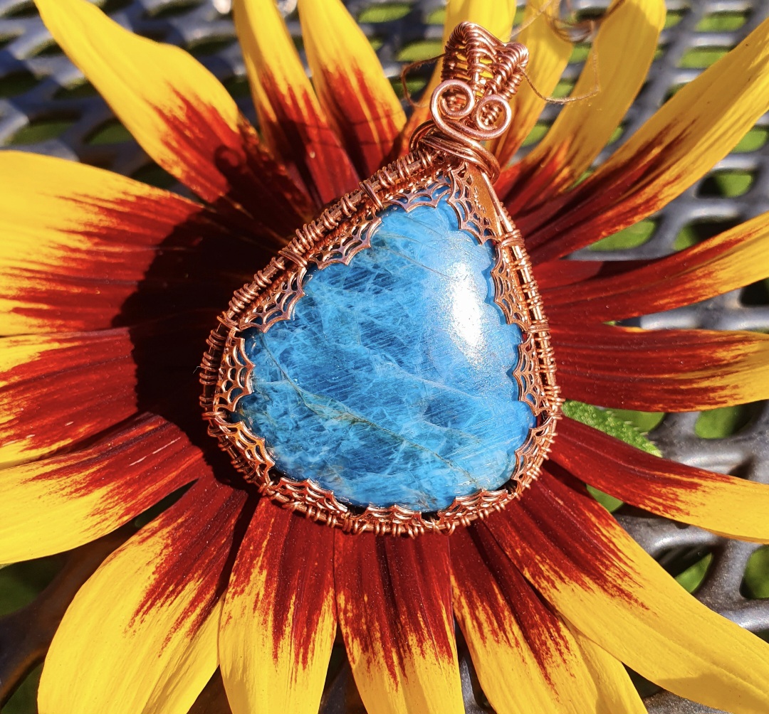 This bold and beautiful Apatite pendant is wrapped in copper wire with a copper cobweb gallerywire design.