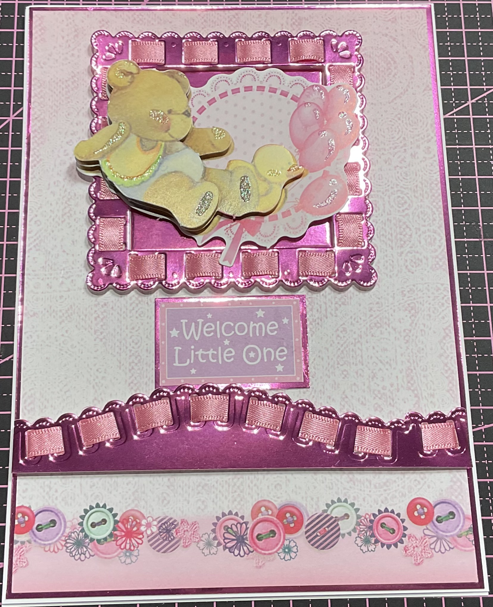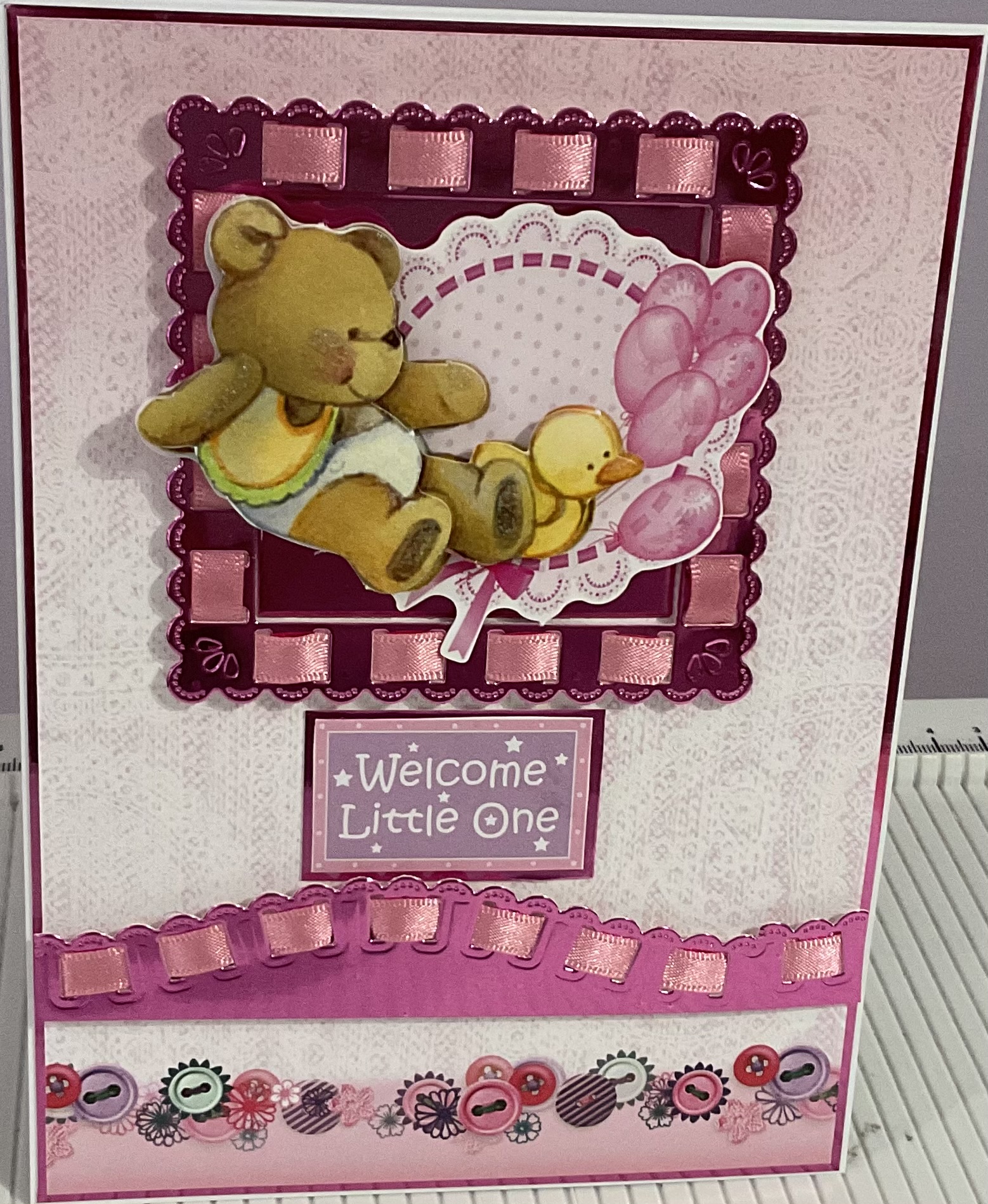 Handmade baby girl card,decoupage detail and ribbon threading detail, tent fold style, size 5×7 inches with envelope and cellophane bag