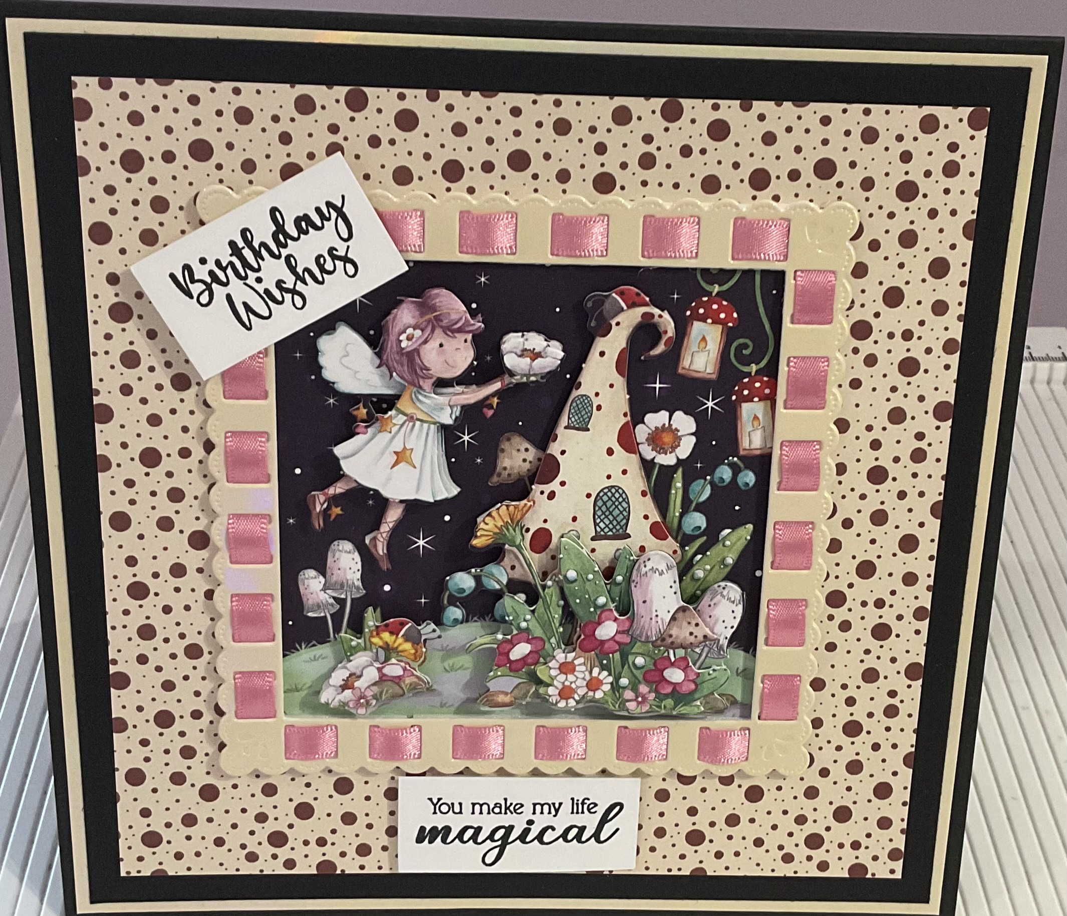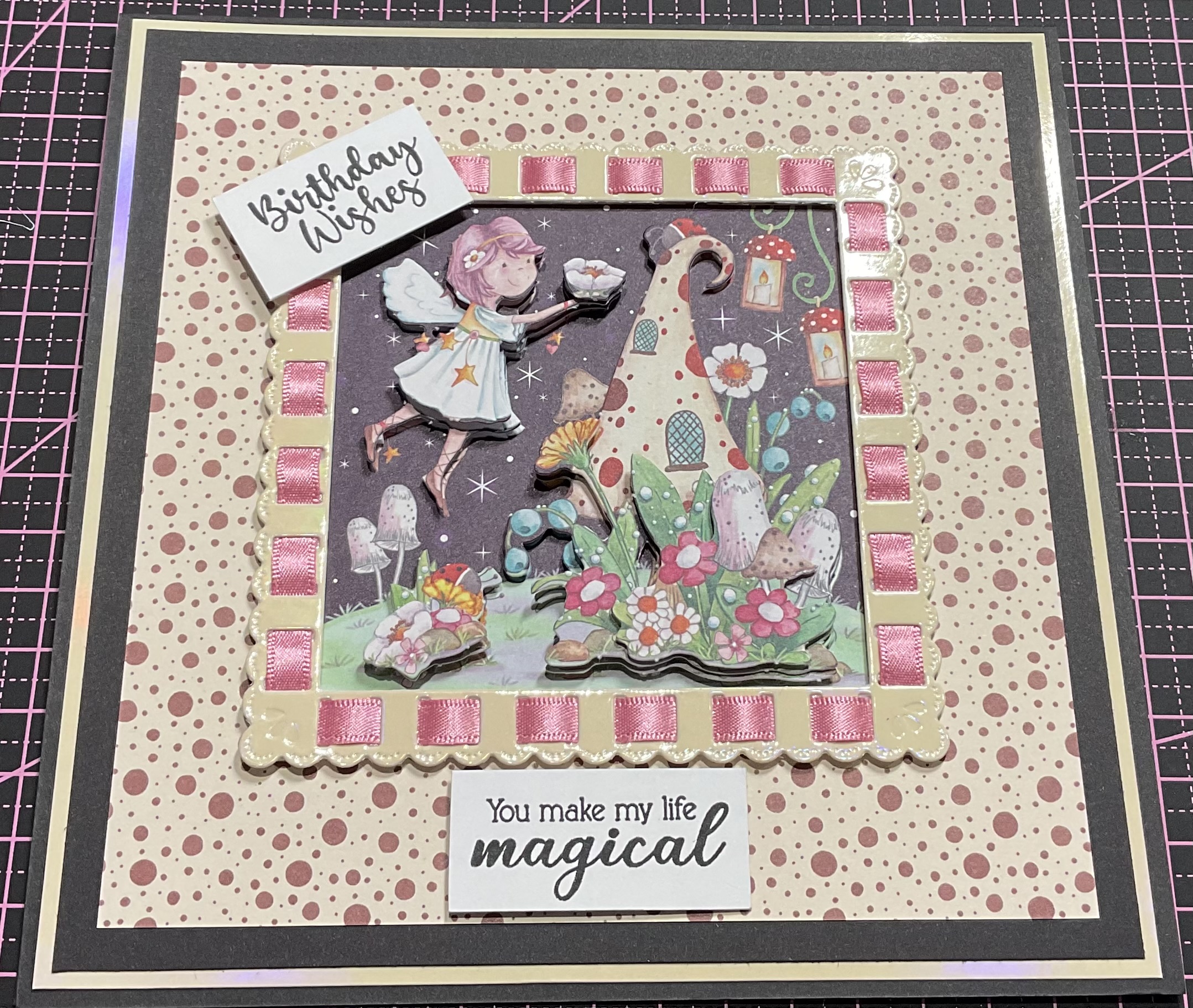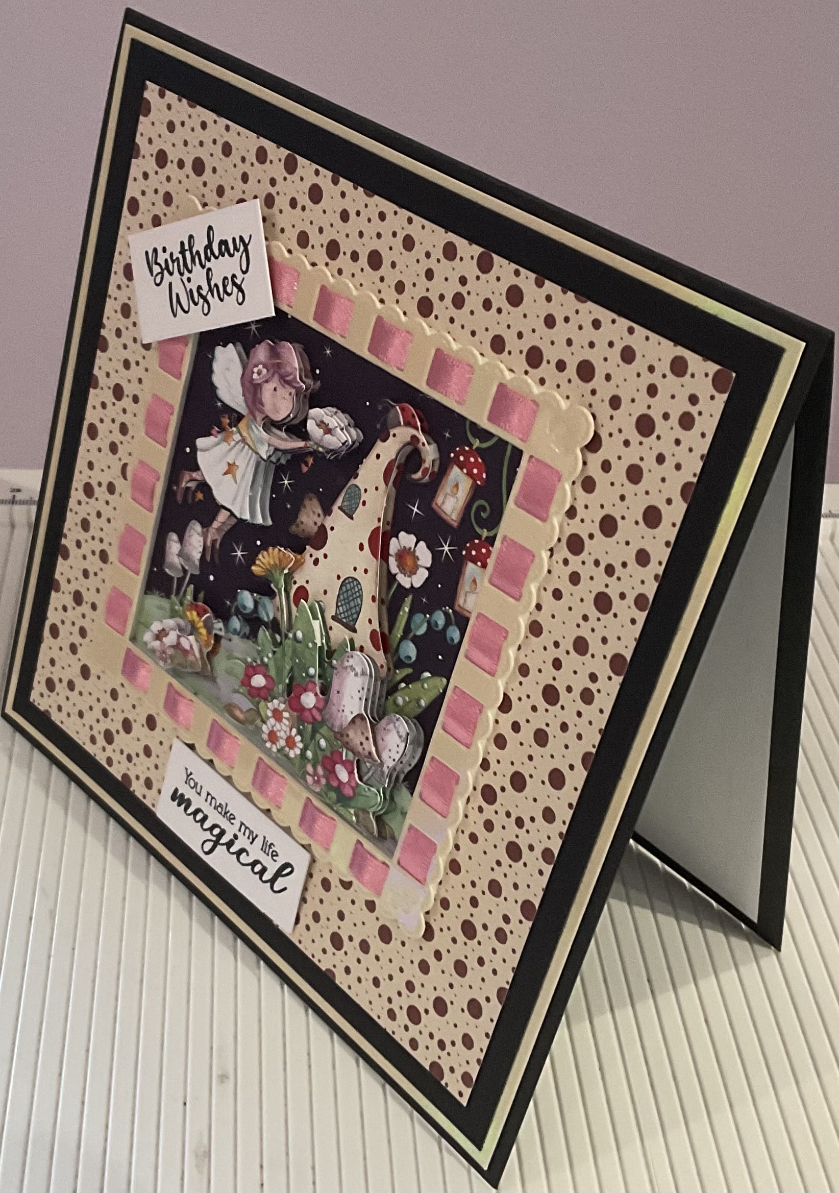 Handmade birthday wishes card, ideal for a little girl , decoupage and ribbon threading detail, tent fold style card, black card size 7 x7 inches with envelope and cellophane bag