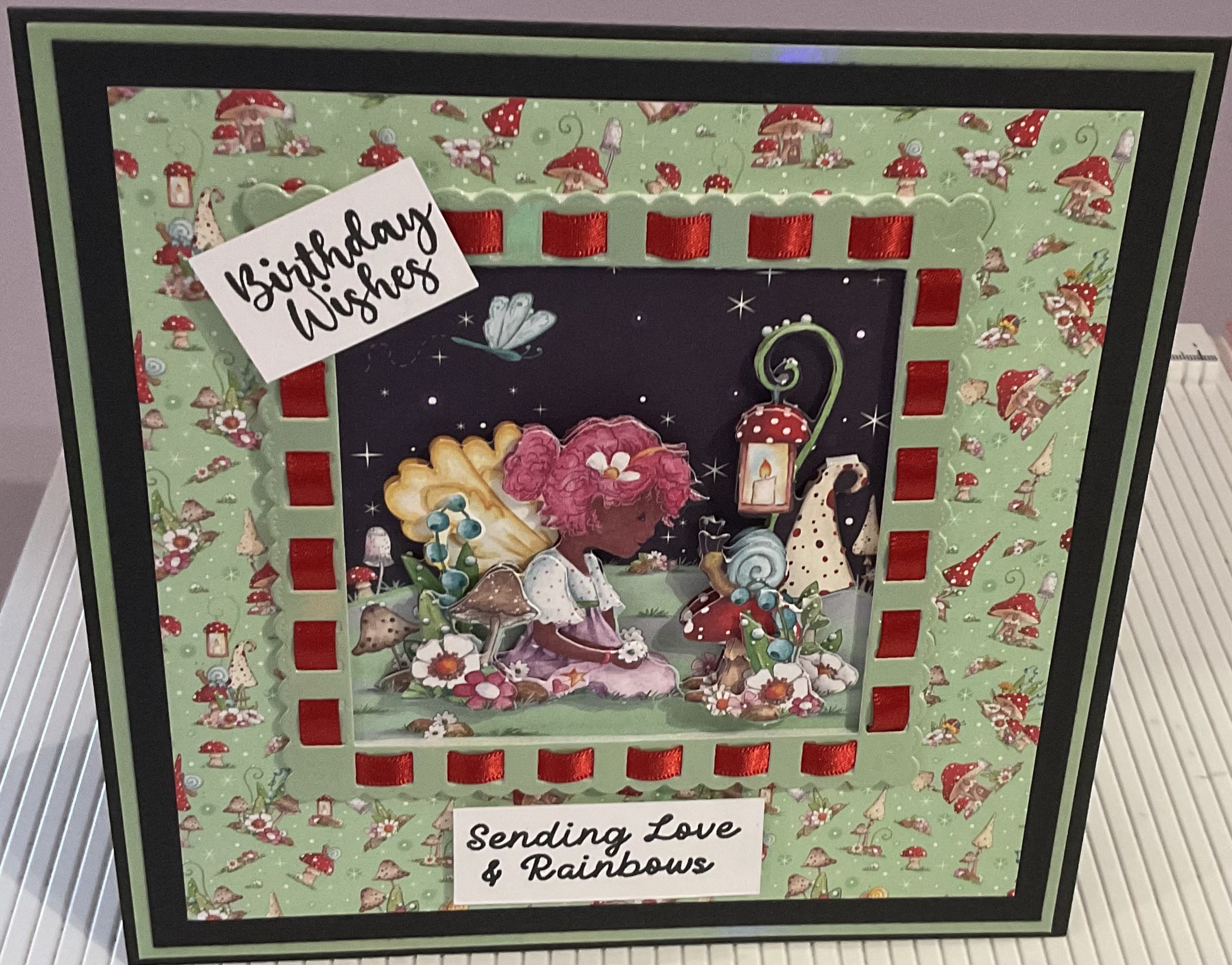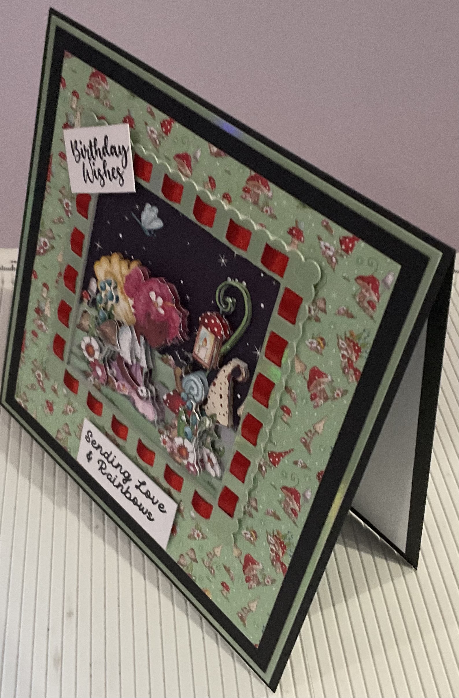 Handmade birthday wishes card, decoupage and ribbon threading detail, tent Fold style card, size 7×7 inches with envelope and cellophane bag