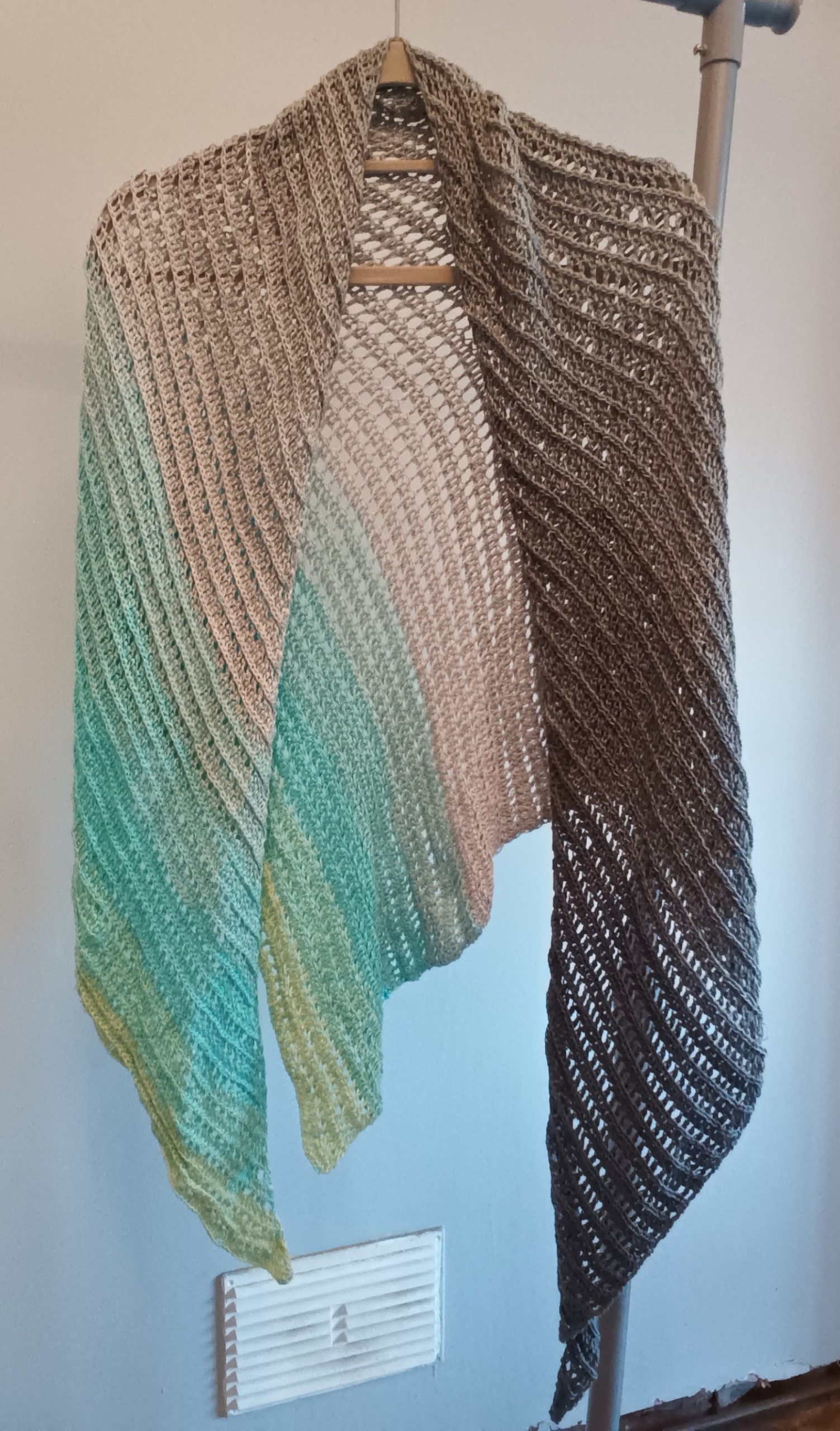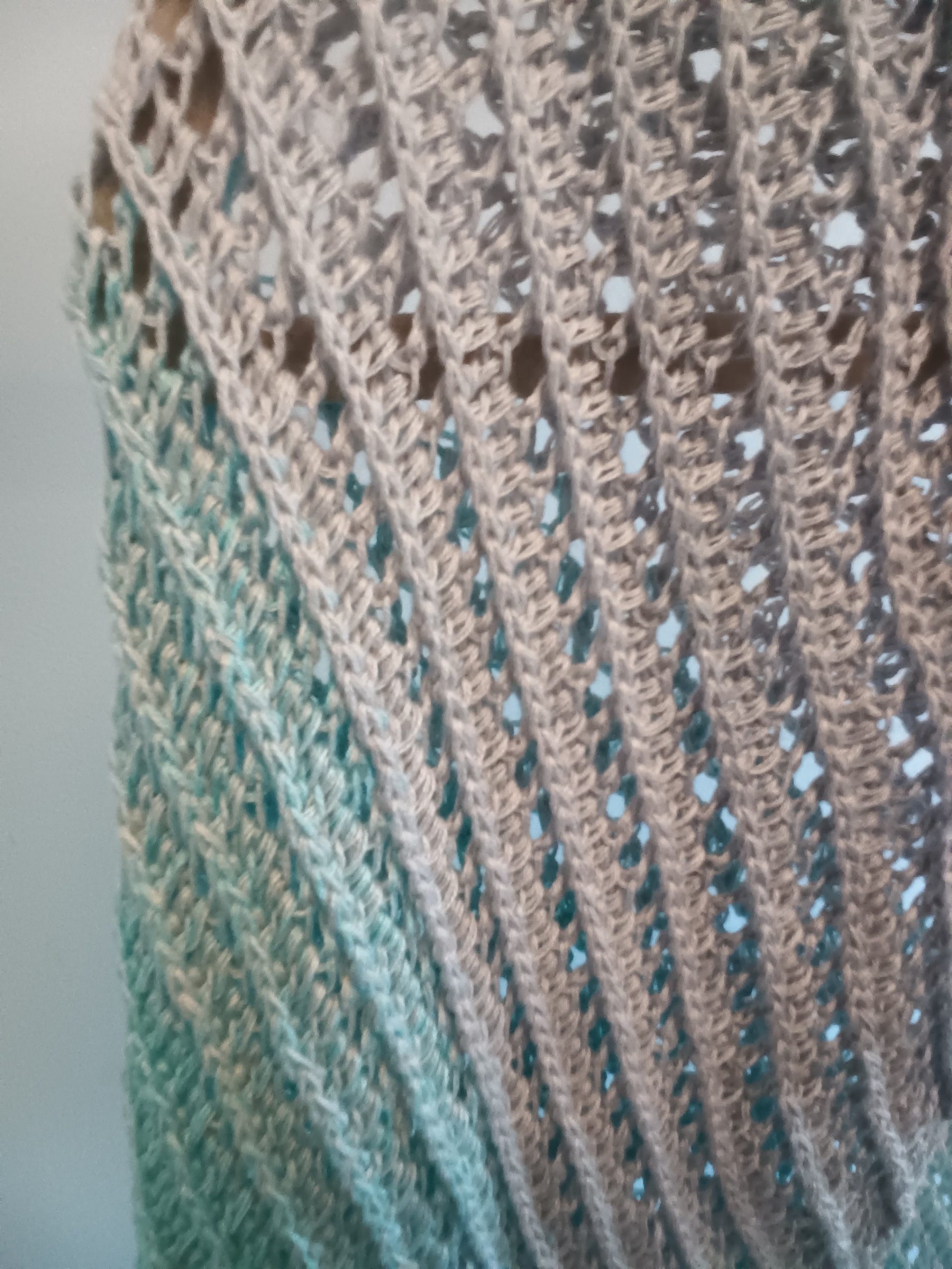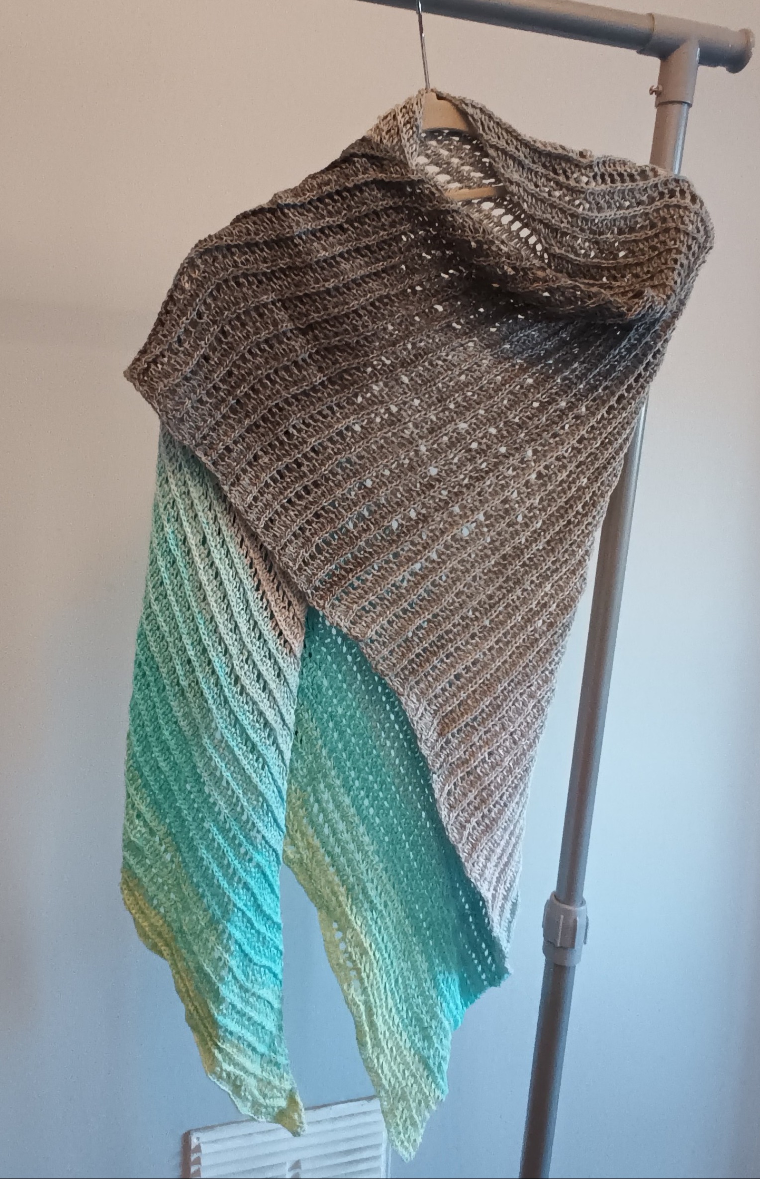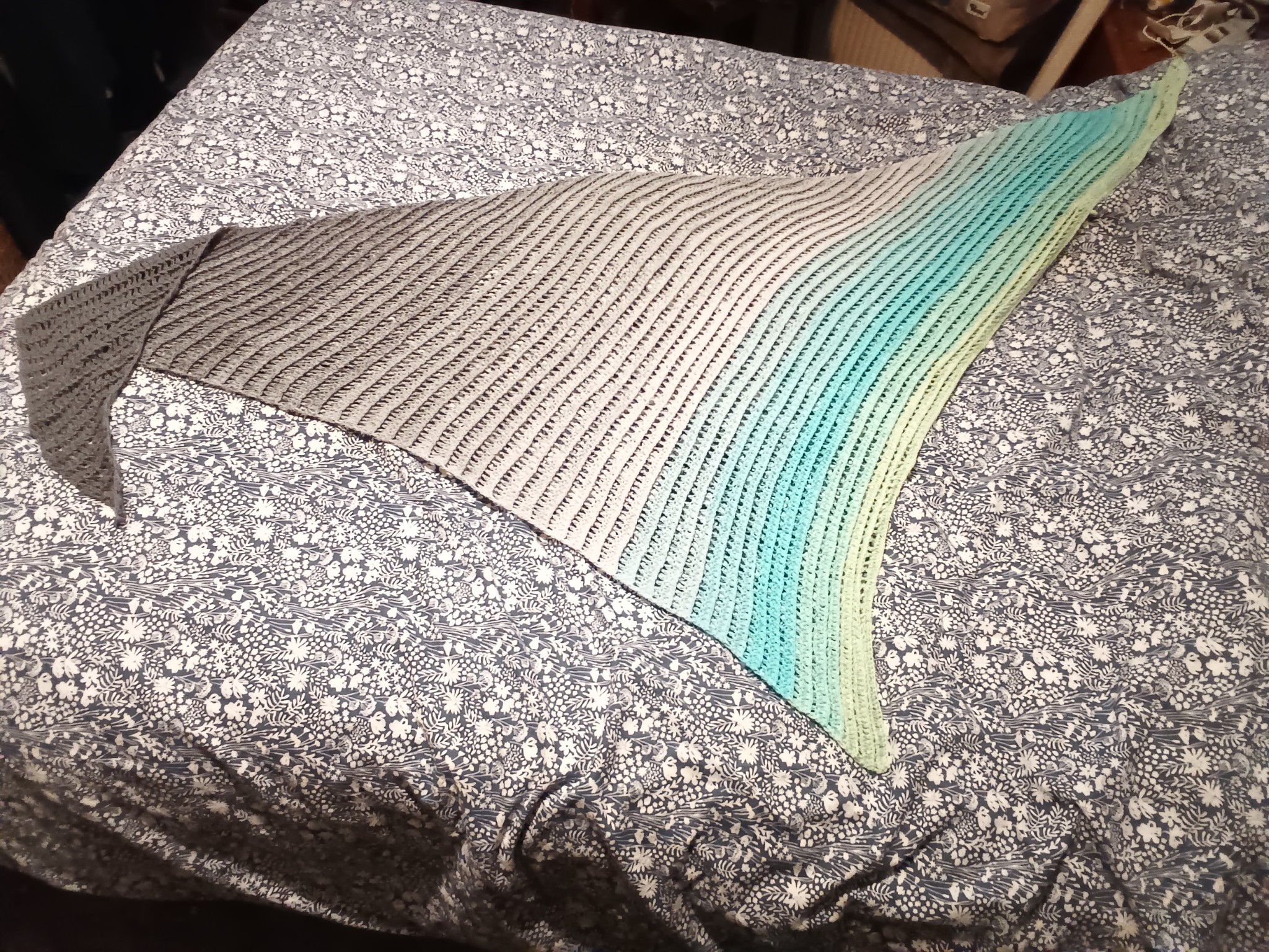 Lovely asymmetric shawl in turquoise and grey shades. This shawl in lovingly made and would make a great present at any time of year.