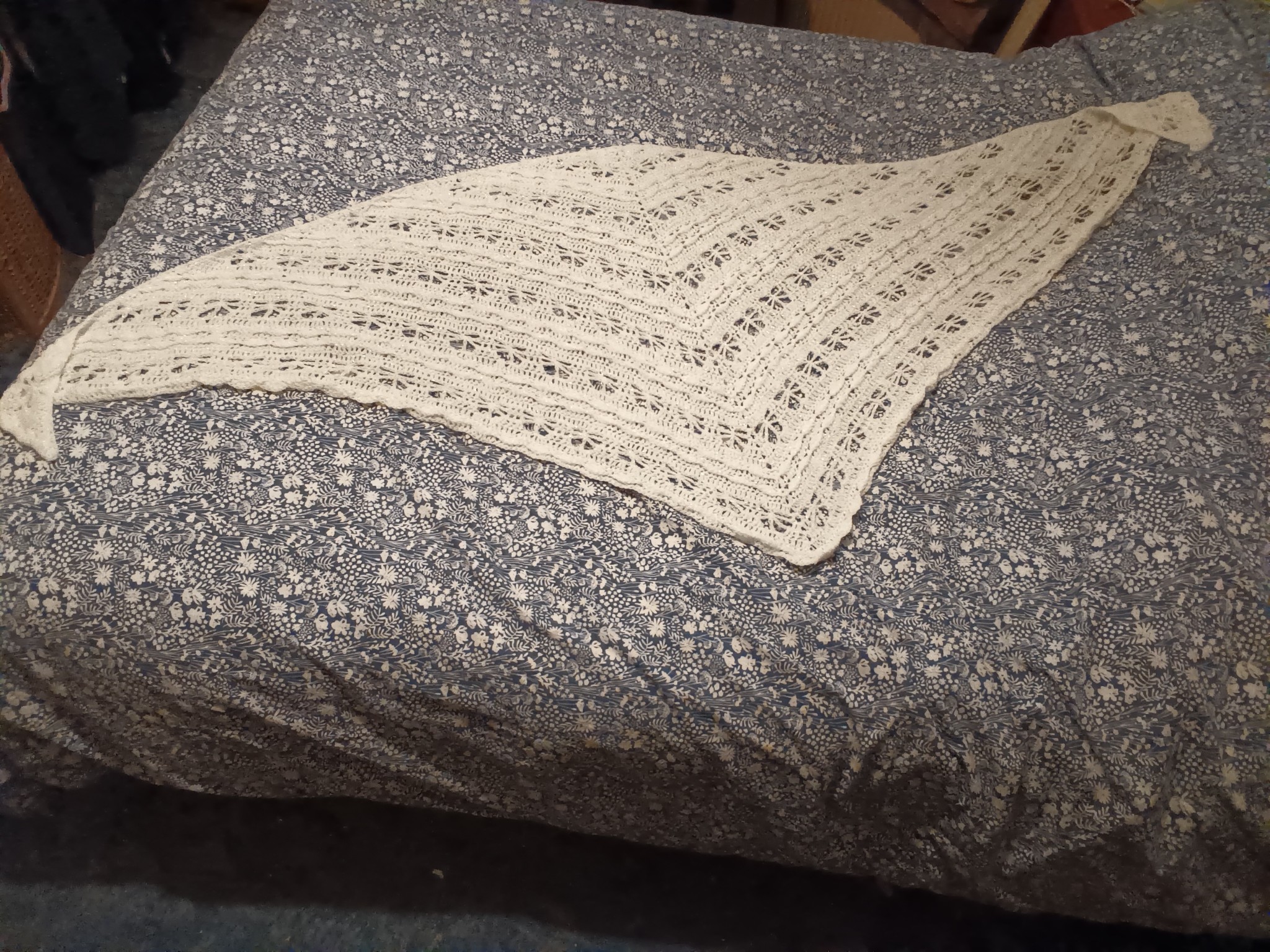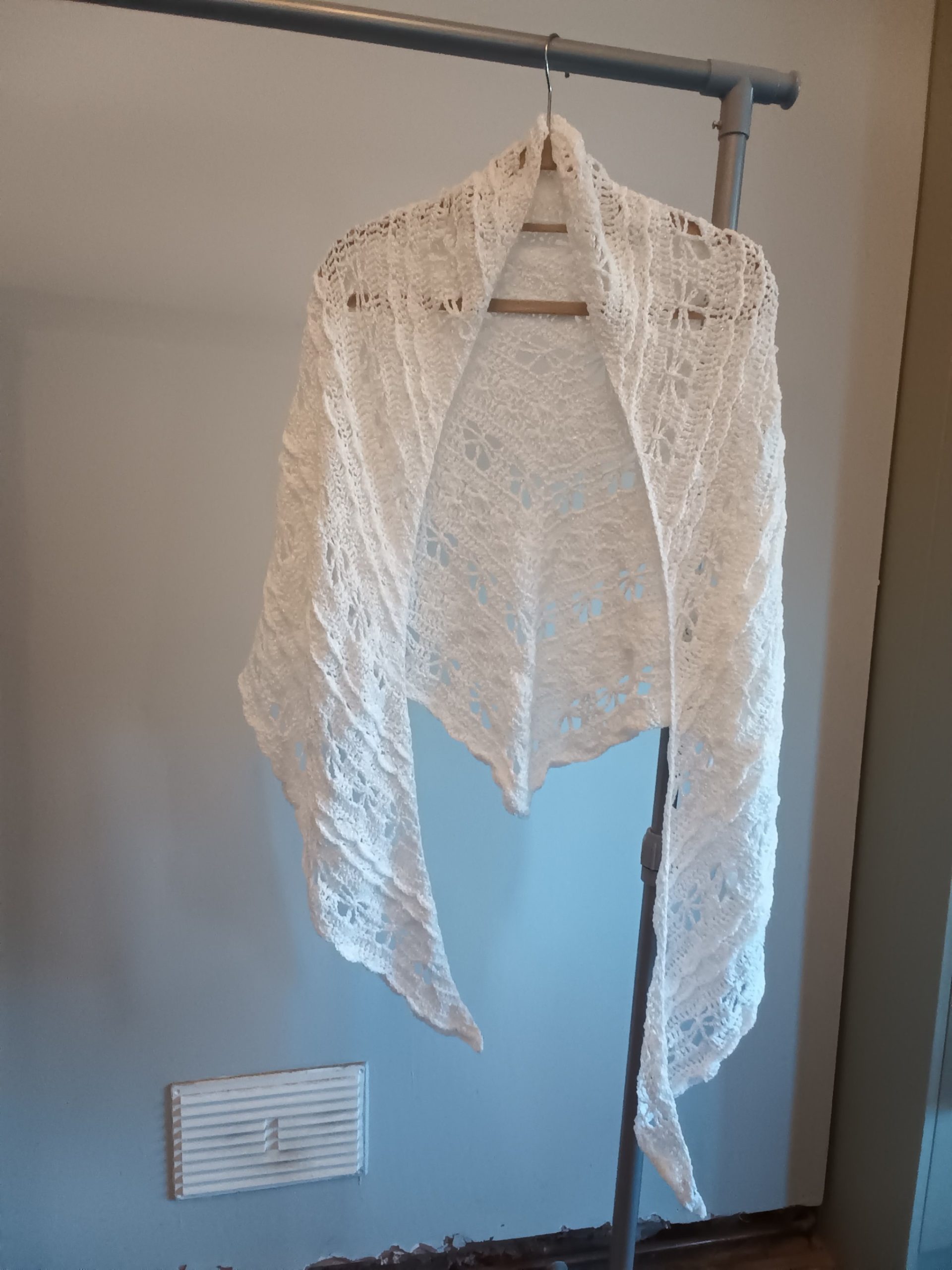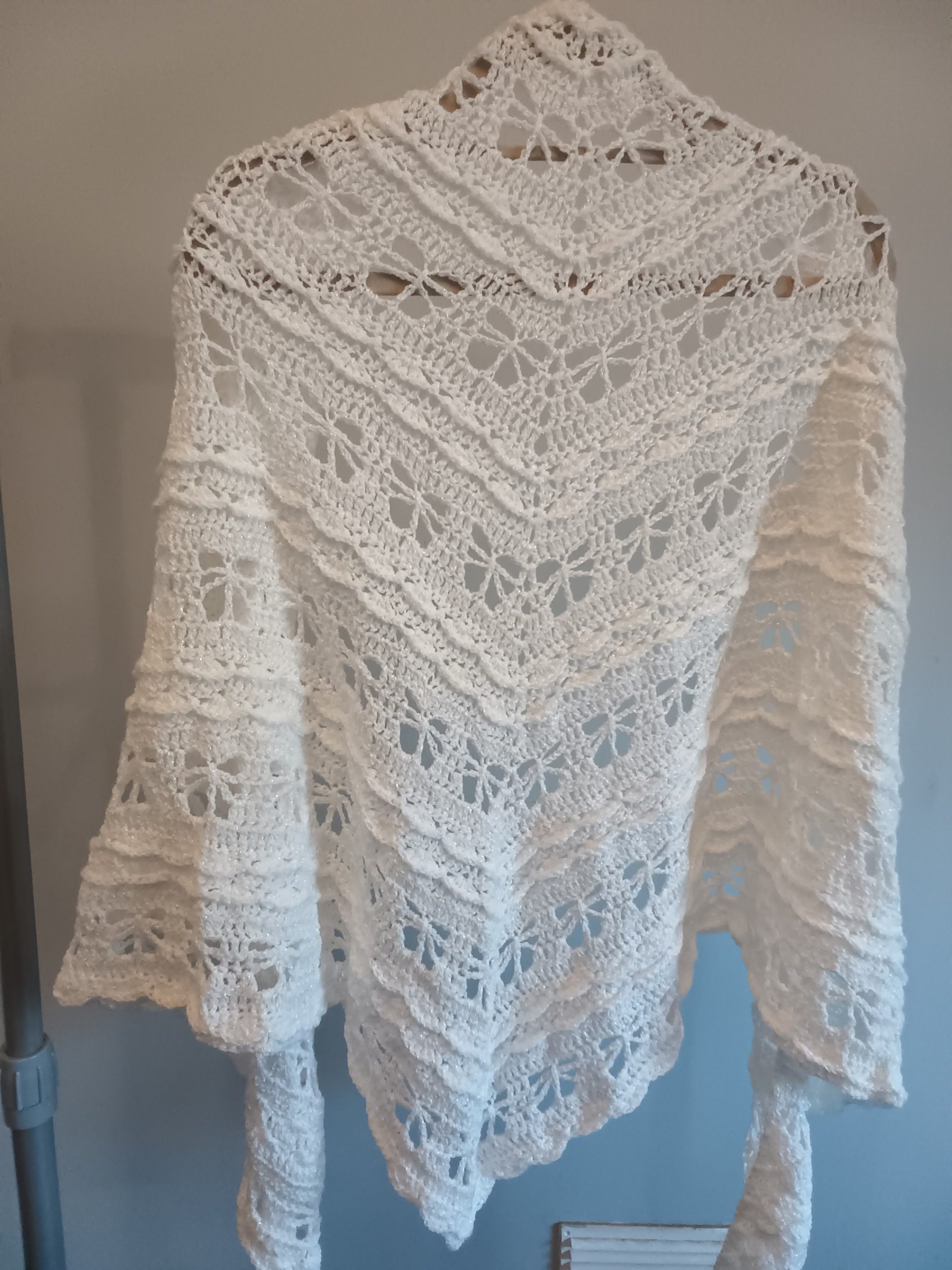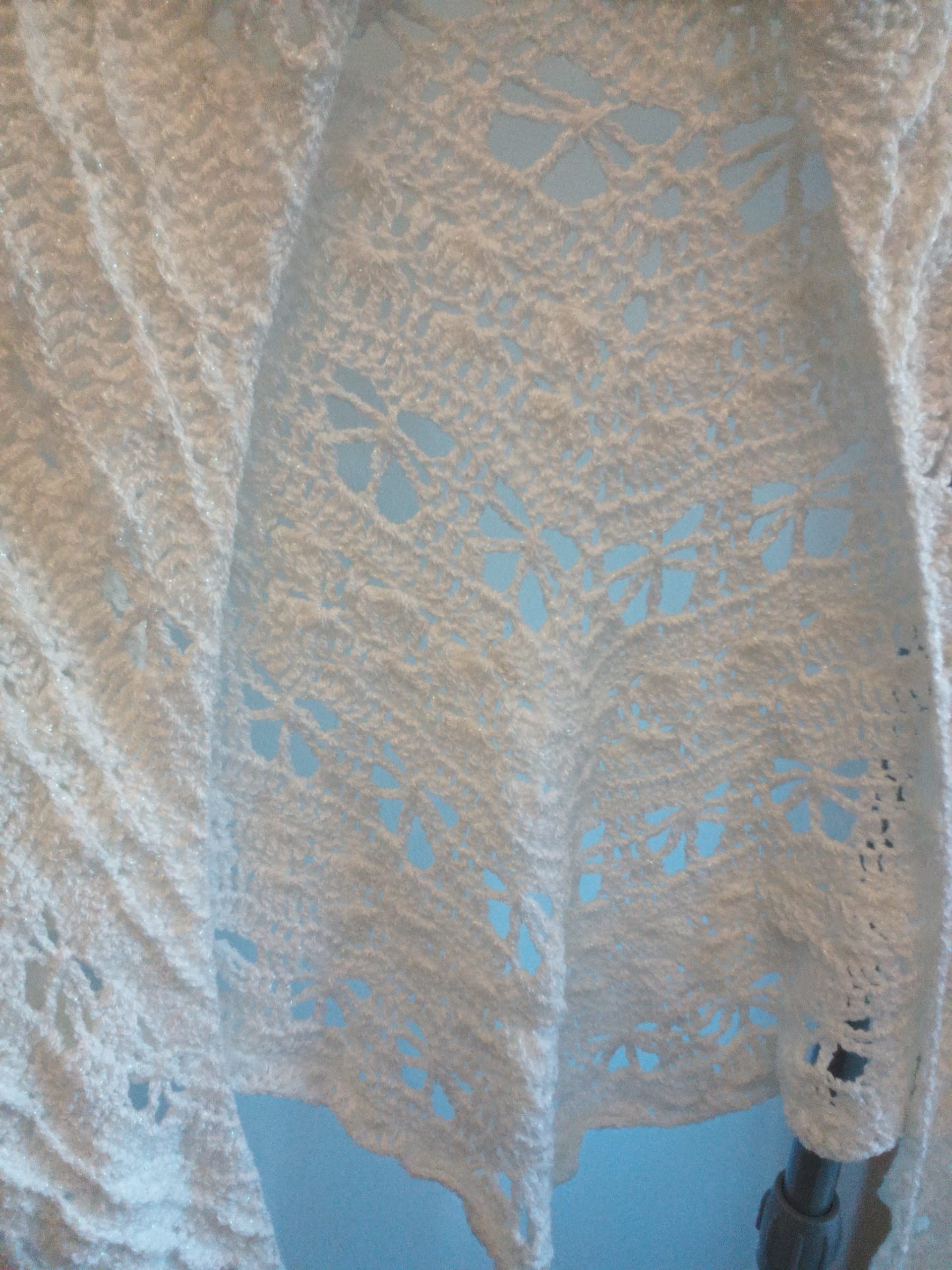 Pretty Butterfly pattern shawl, lovingly handmade in a white yarn that has a fine glitter strand woven into it. Would make a lovely present at any time of year.