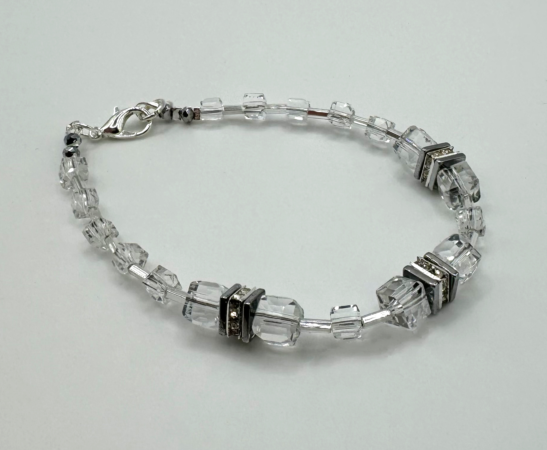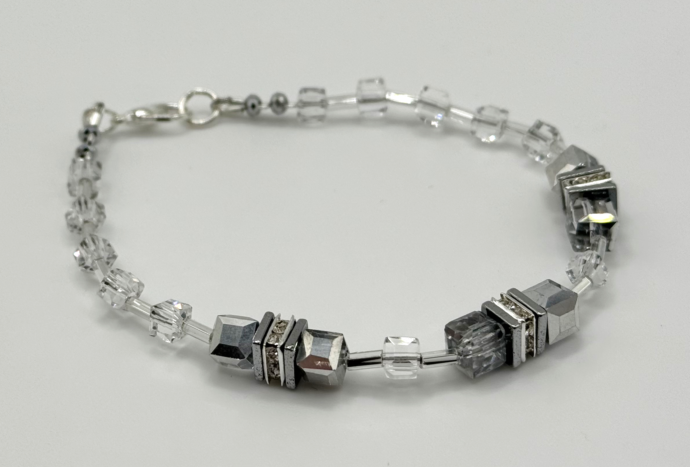 Large silver and small crystal cubes float between silver diamanté squares to fashion these stunning bracelets.