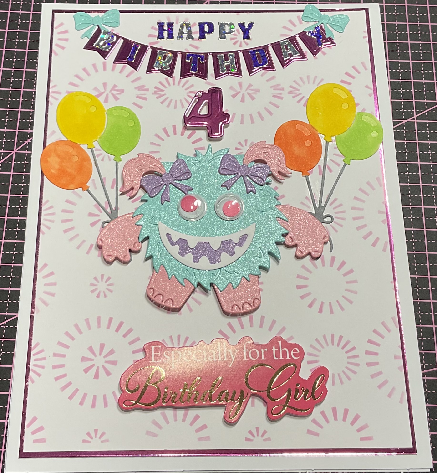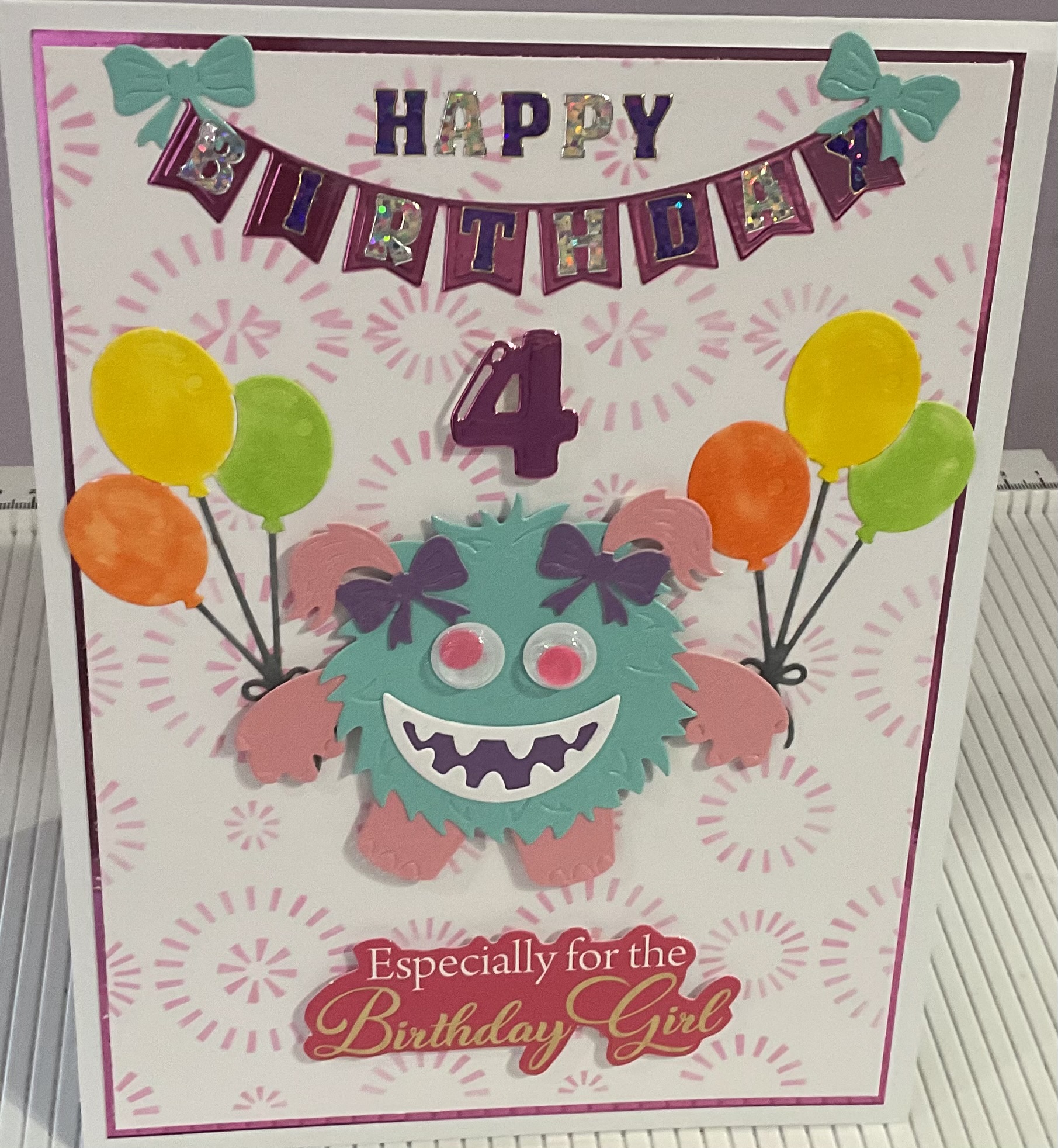 Fun birthday card for a little girl, age 4 years old a lovely bright colourful card , tent fold style card, size 8×6 inches with envelope and cellophane bag