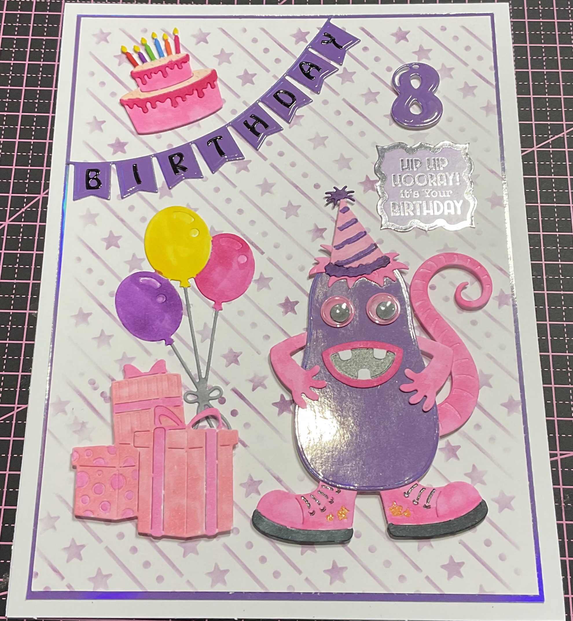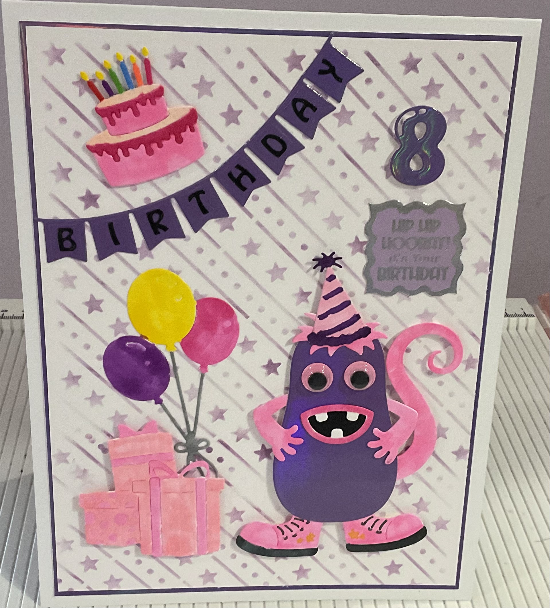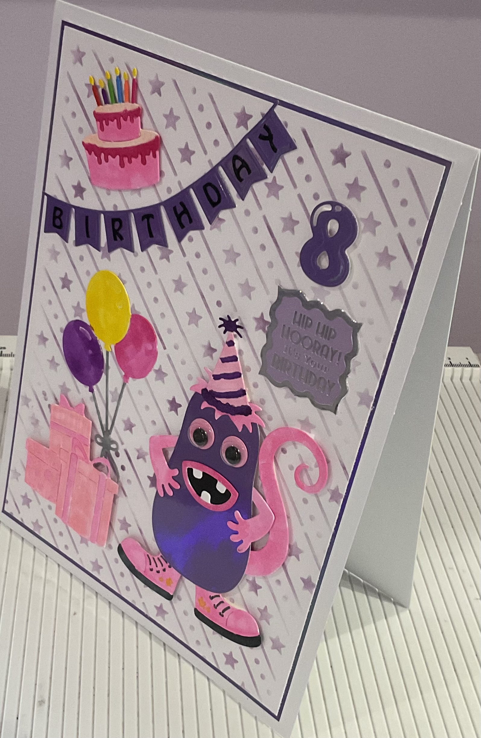 Fun happy birthday card for a girl, age 8 years old tent fold style card, size 8×6 inches with envelope and cellophane bag