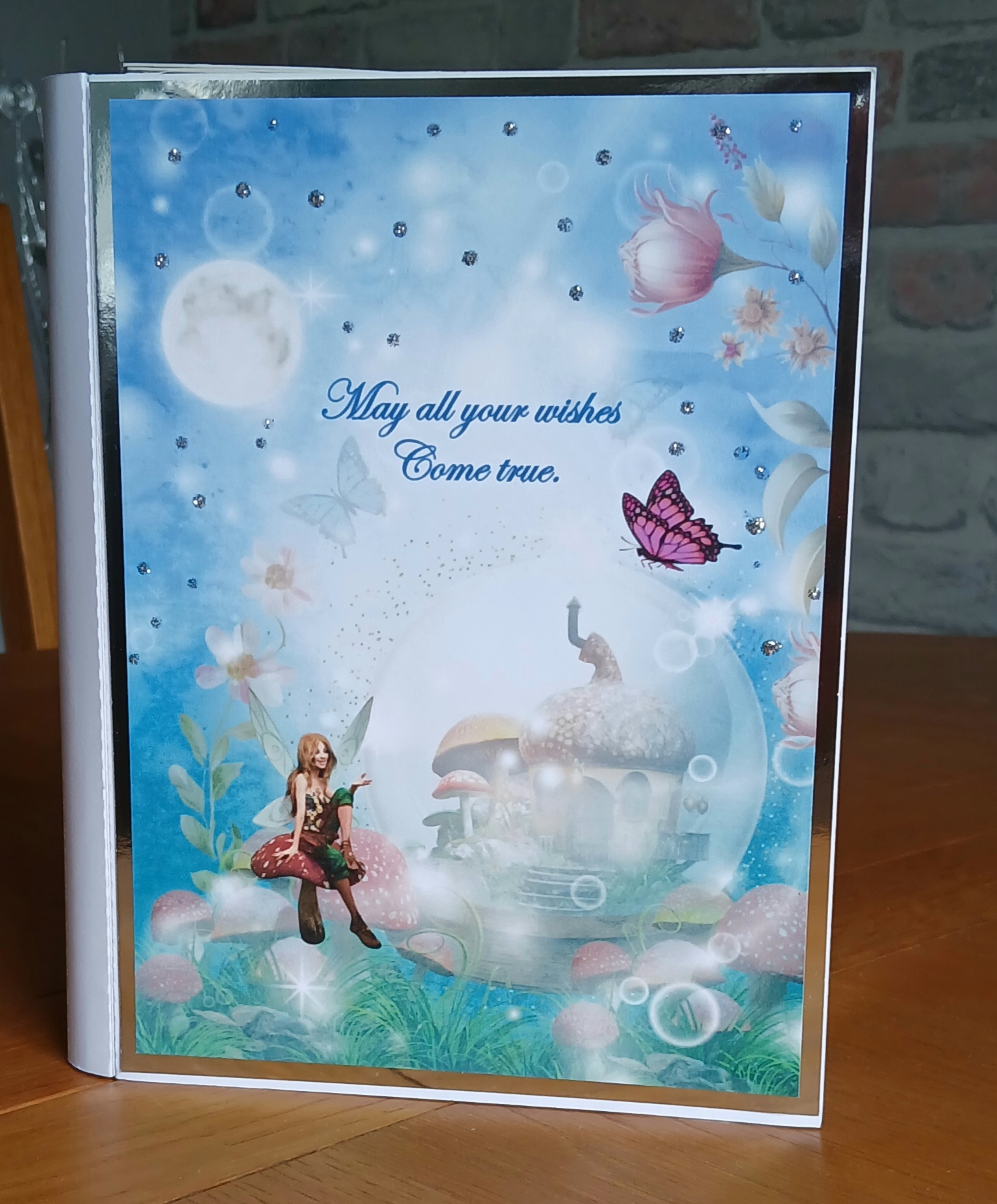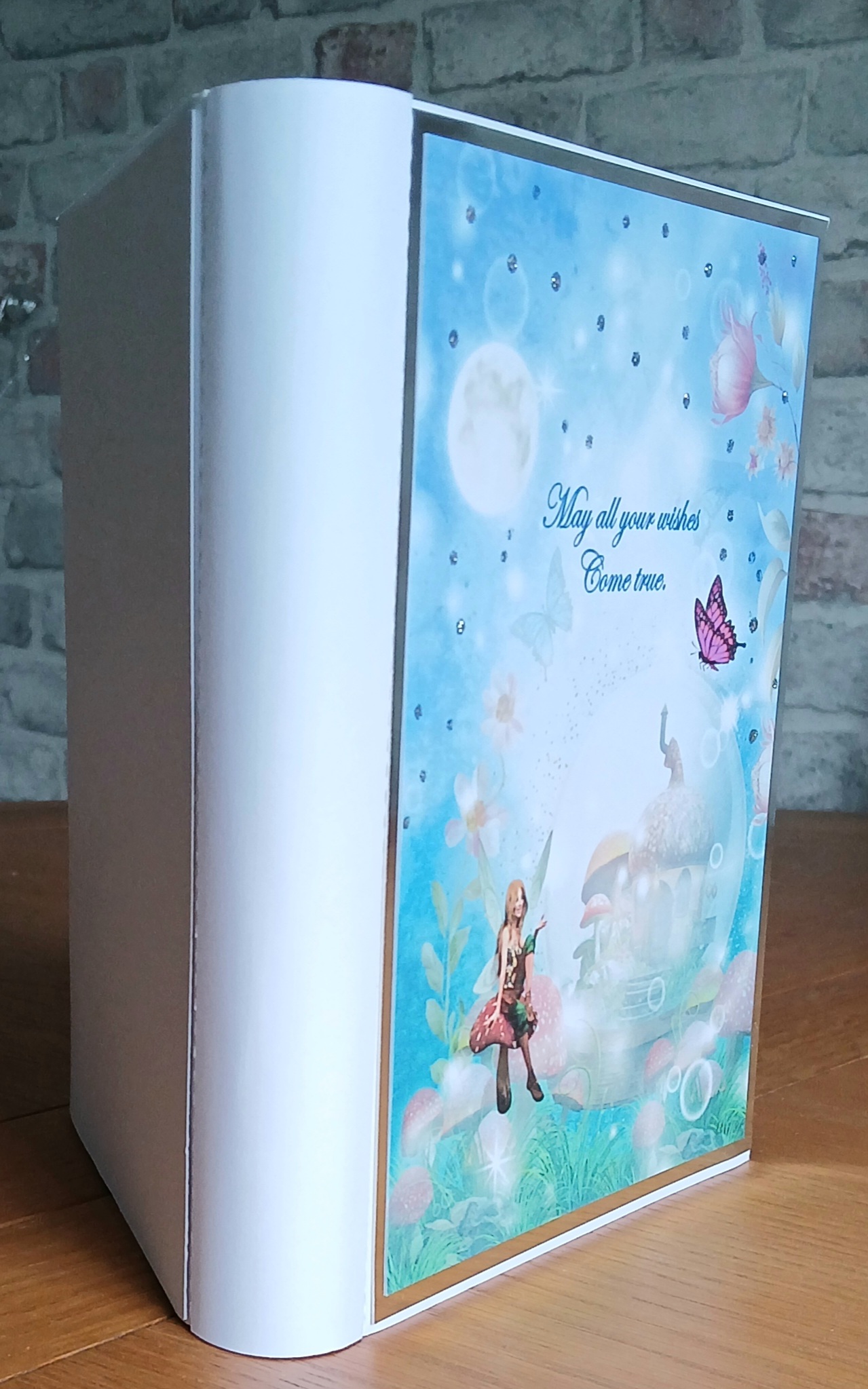A pretty fairy book card/Gift box. Decorated with fairies and toadstools inside and out. Perfect for anyone who loves fairies and fantasy. Can be used as a card or perfect to put a little gift inside. It measures 21×15 cms. Post and packing is included in the price.
