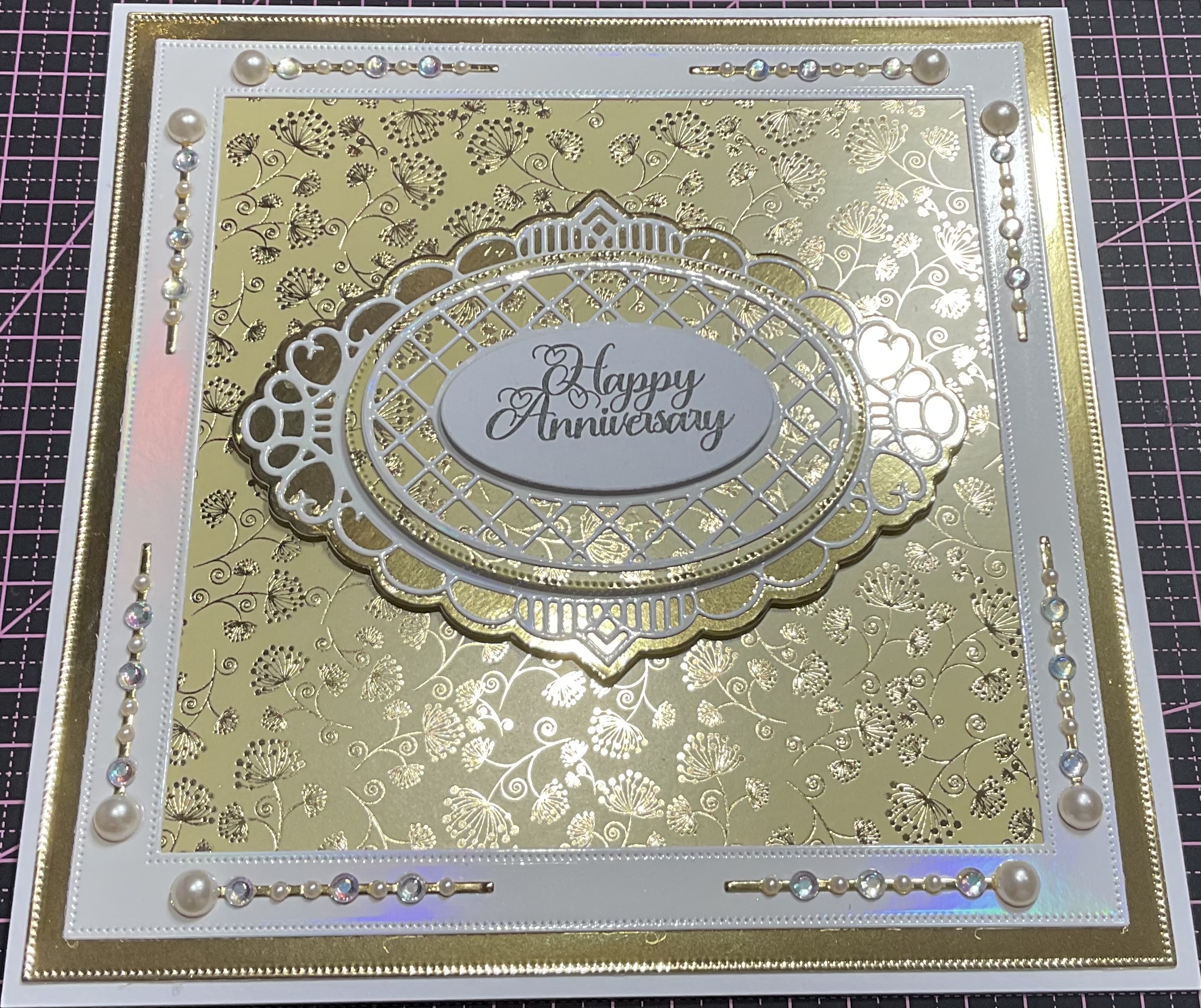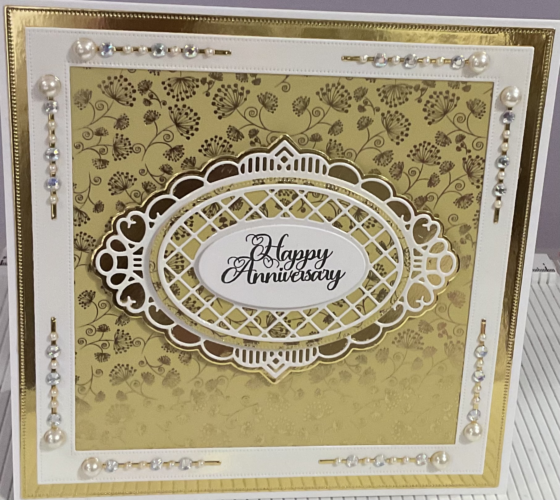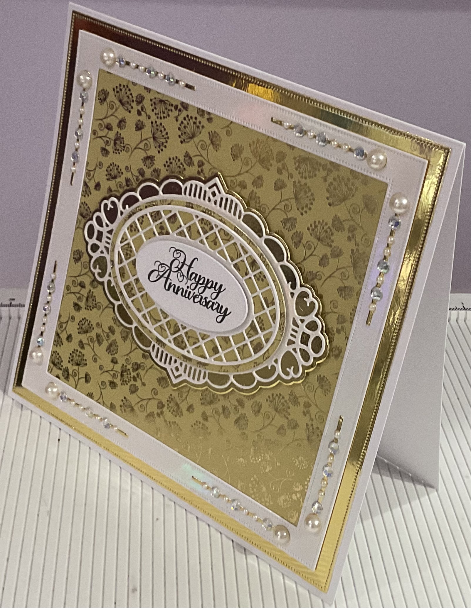 Beautiful happy anniversary card beaded and foiled detail, colour gold and white, tent fold style card, with envelope and cellophane bag