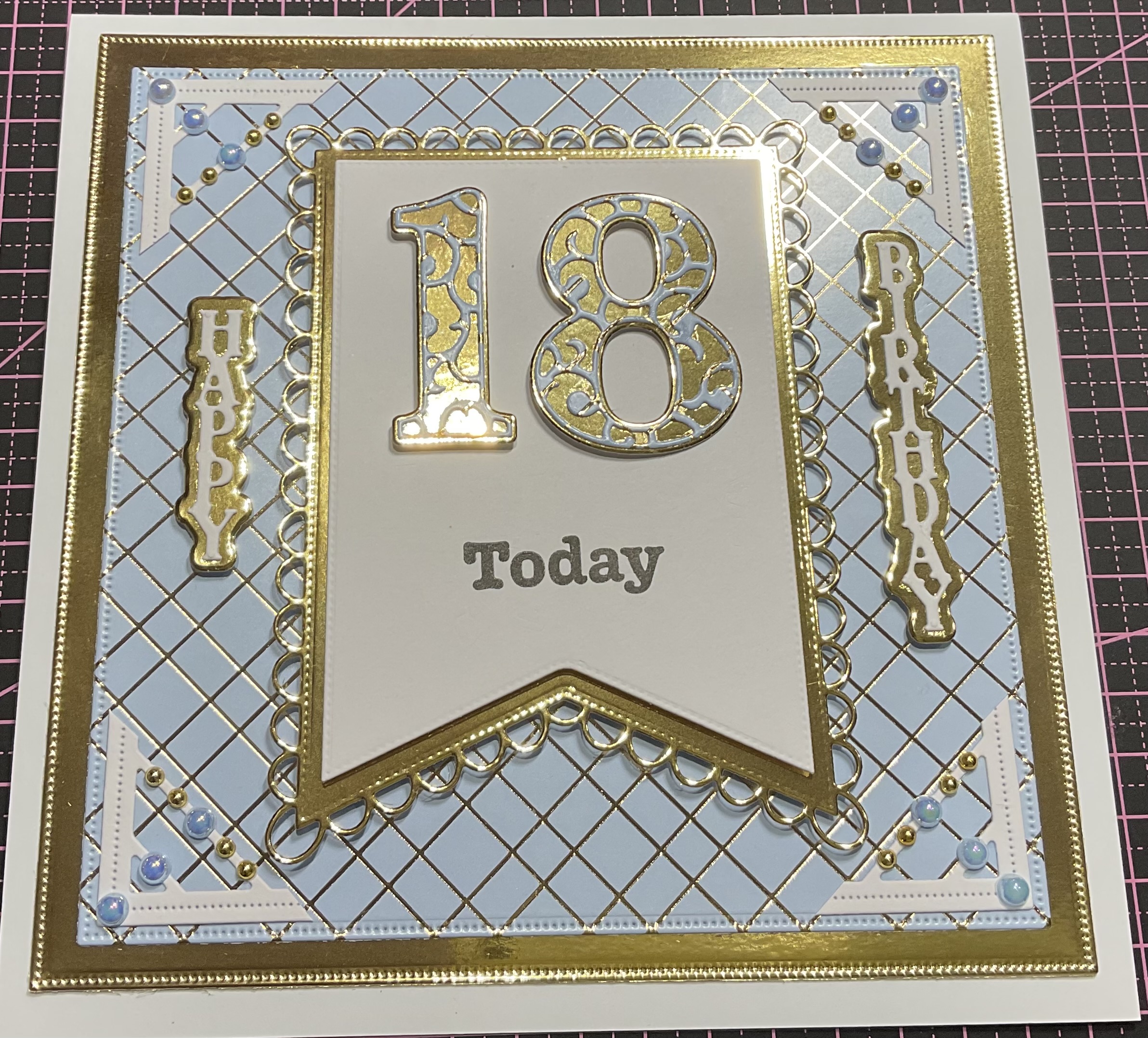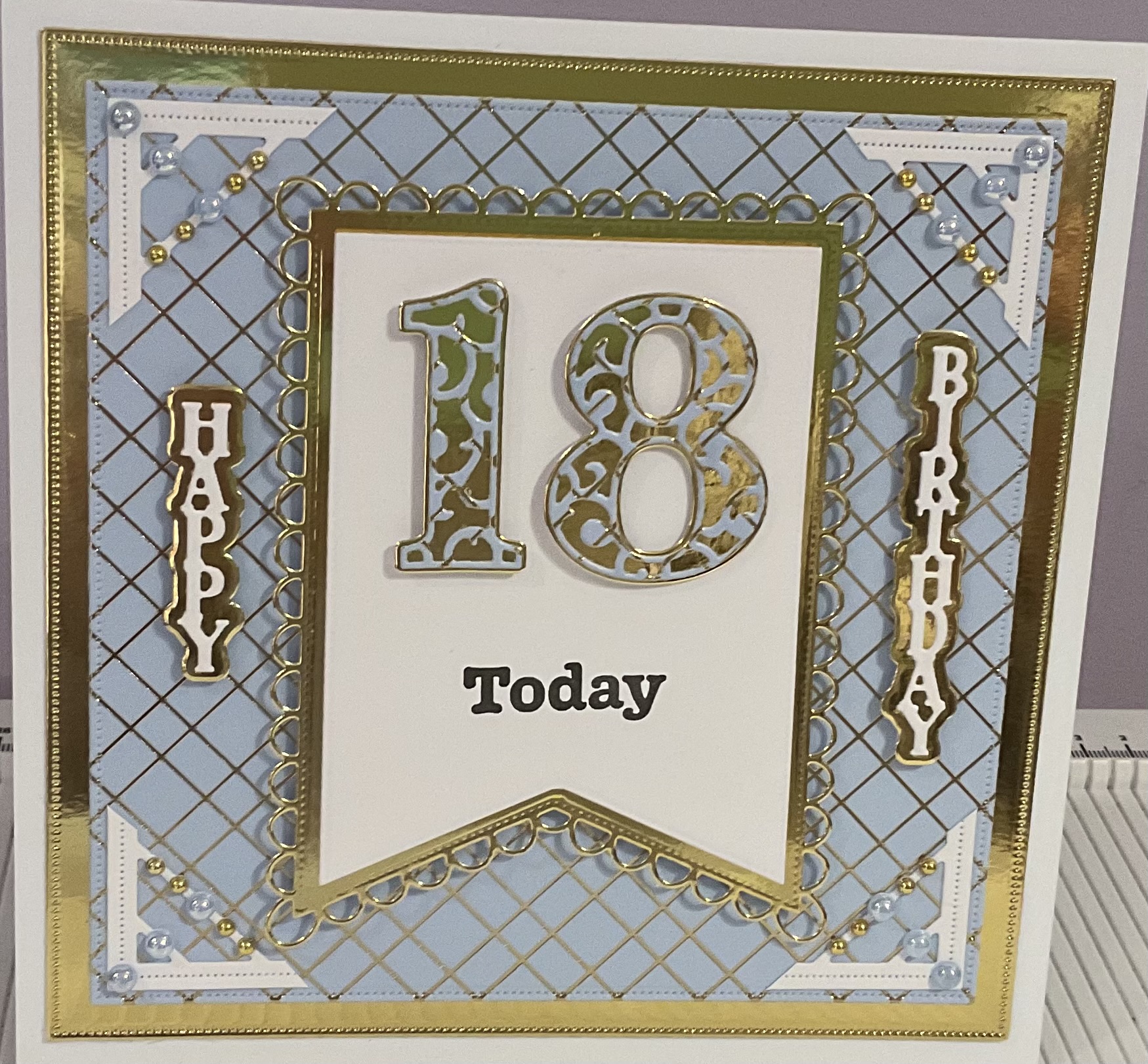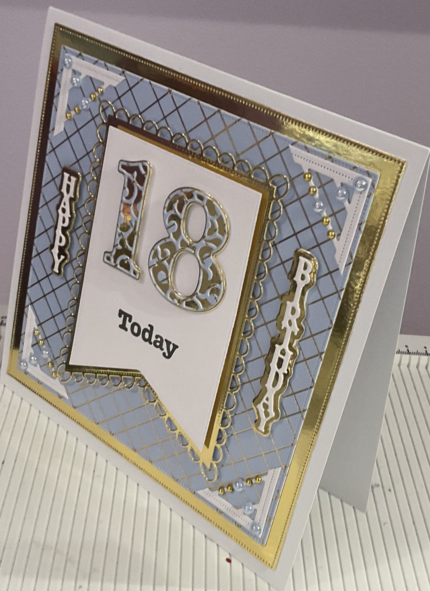 Handmade happy birthday card, for 18 years old, beautiful beaded detail, colour gold ,blue and white, tent fold style size 7×7 inches with envelope and cellophane bag