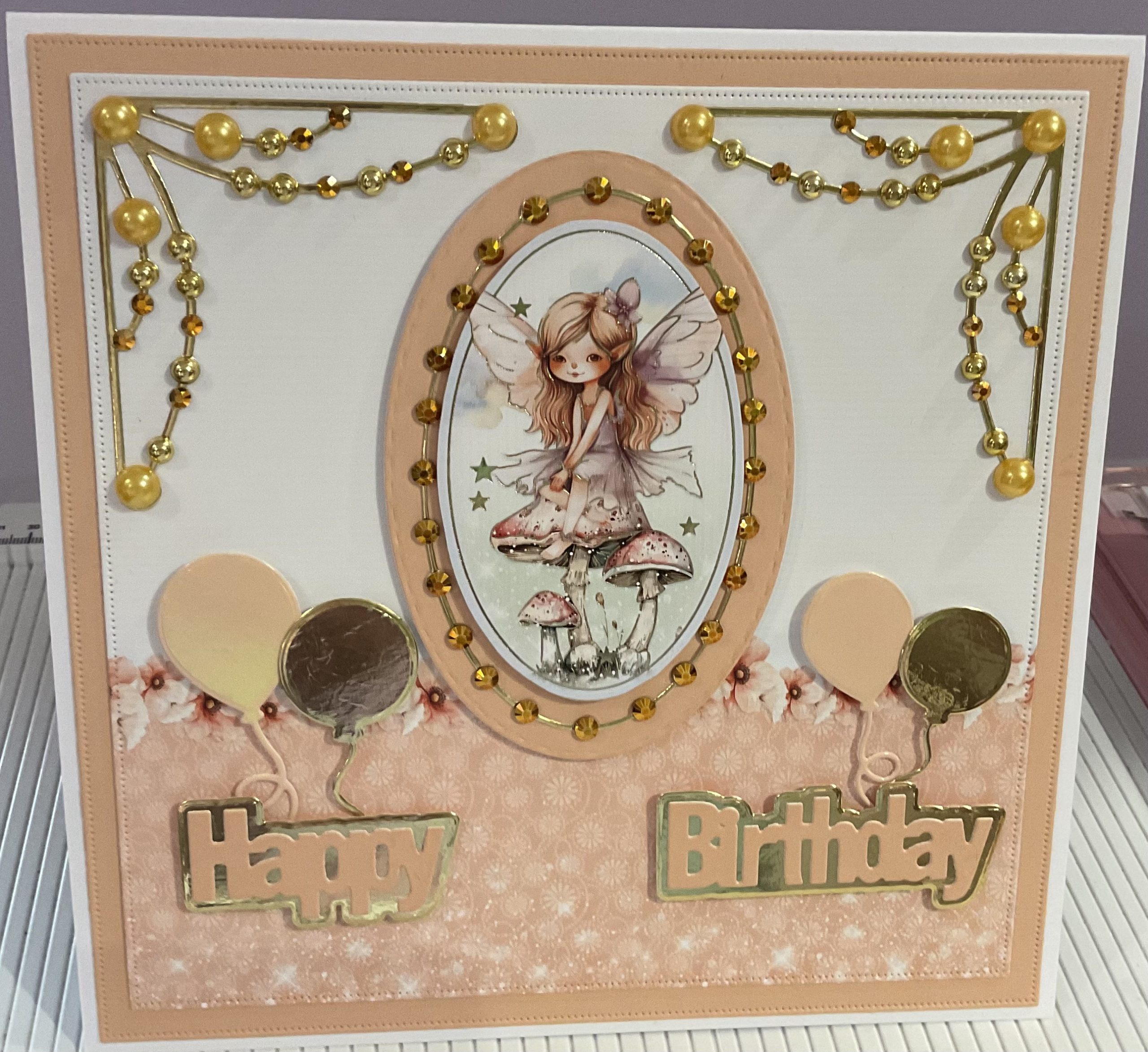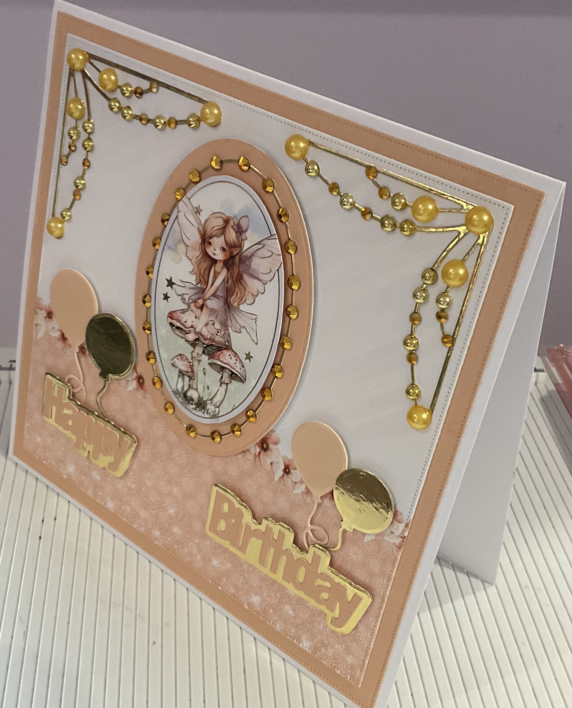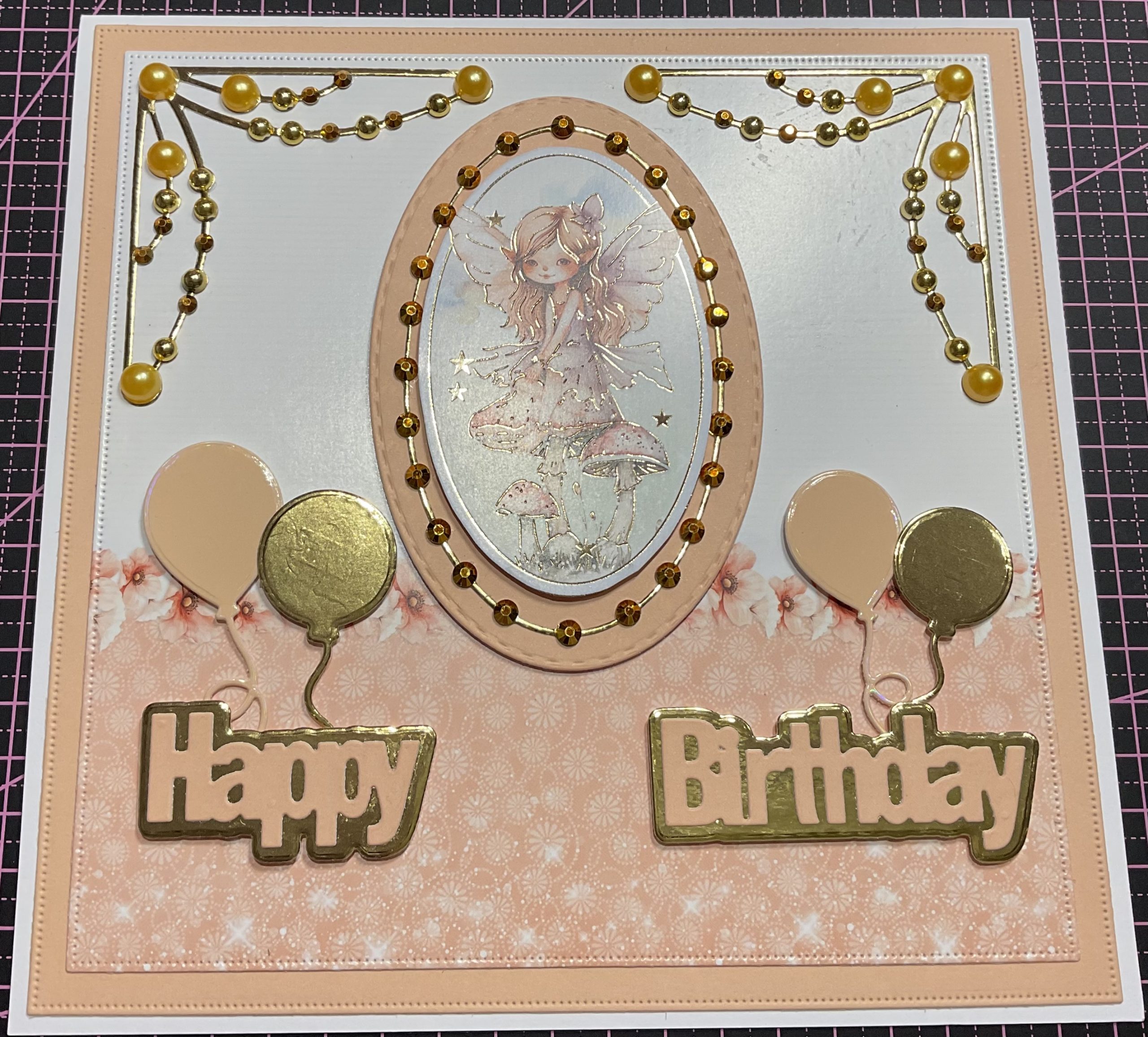 Handmade happy birthday card, beautiful beaded detail, colour gold and peach tent fold style size 8×8 inches with envelope and self seal bag