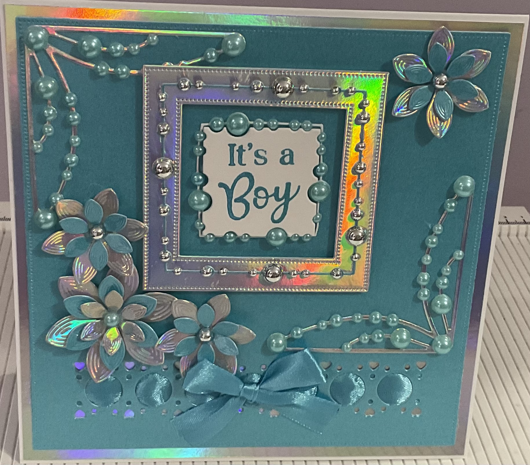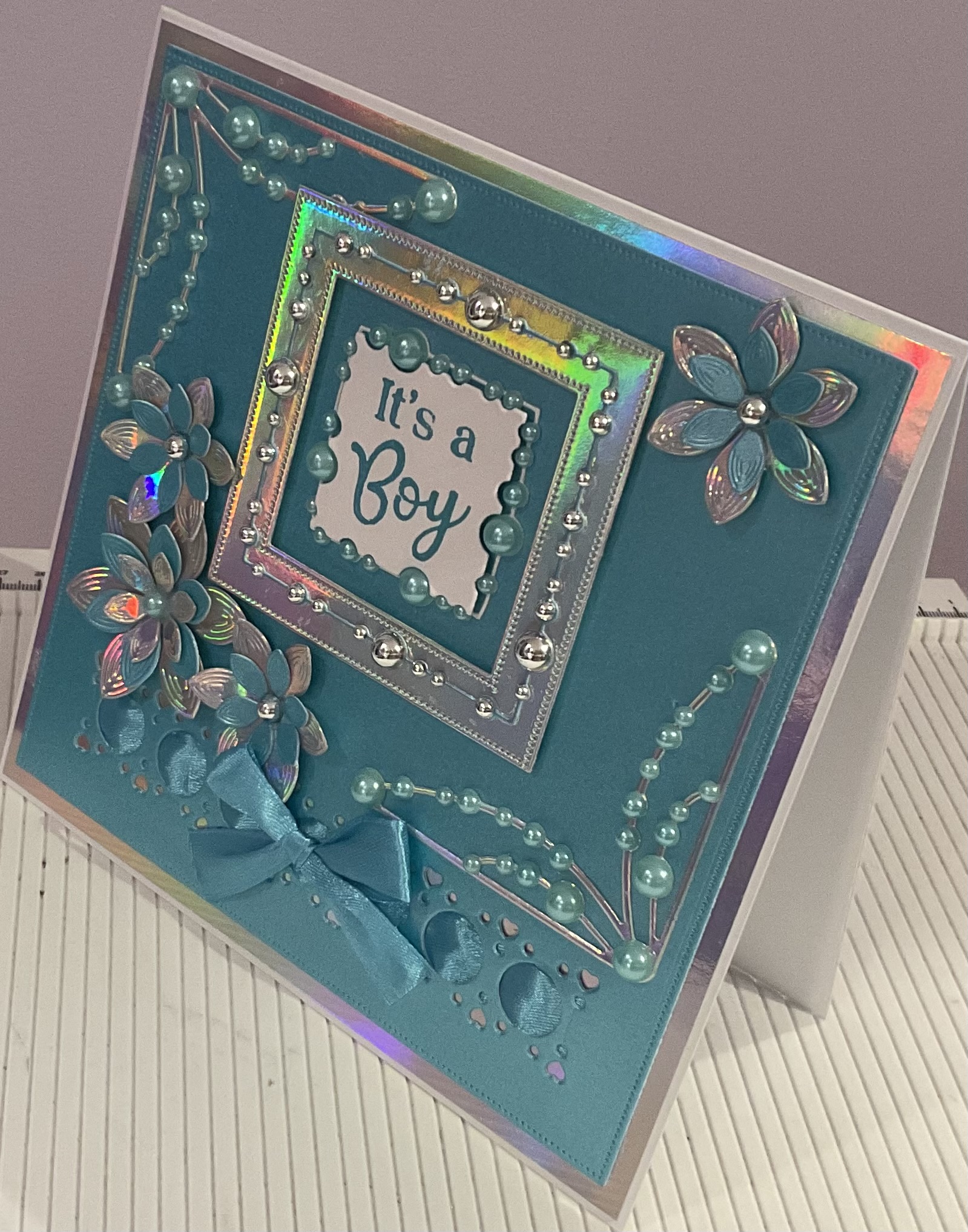 Hand made new baby boy card, beautiful beaded card with ribbon and flower detail,tent fold style card, colour blue , silver and white , size 7×7 inches with envelope and cellophane bag