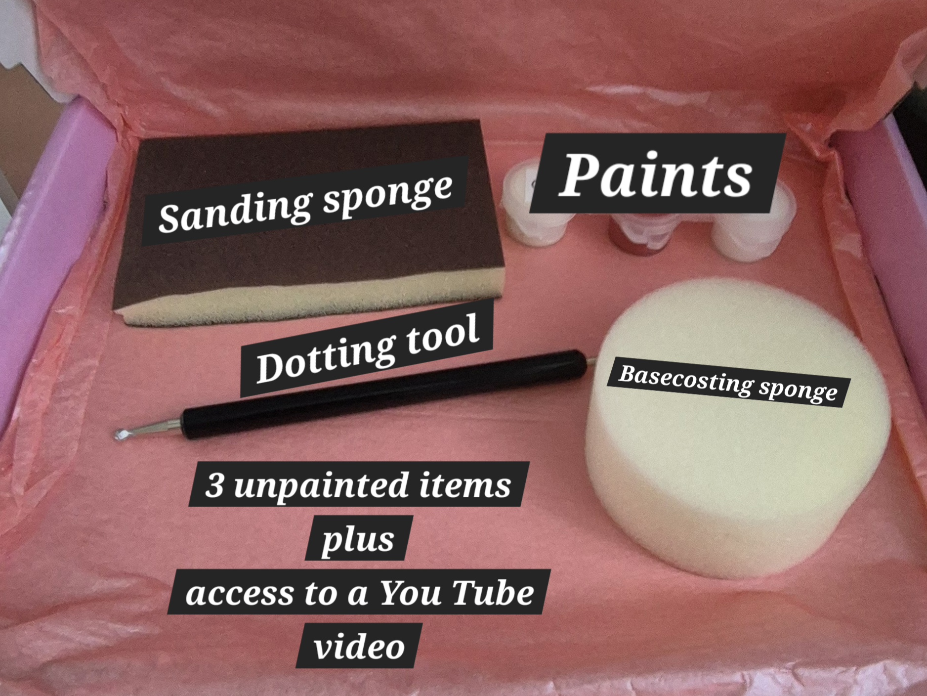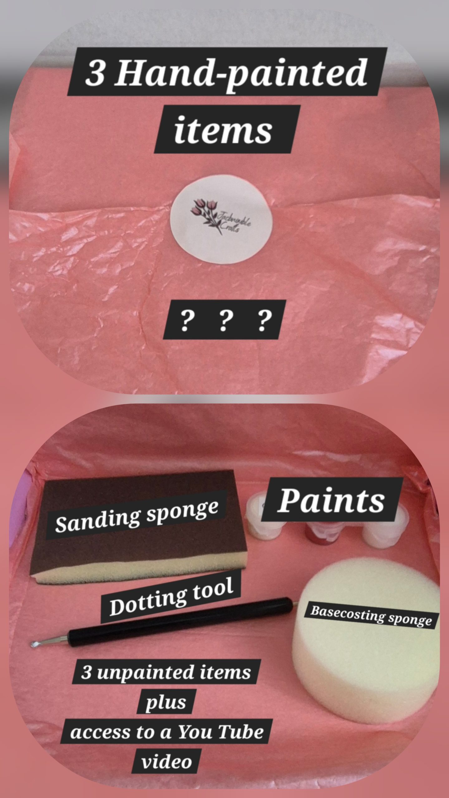 - 3 mystery paintable items, designed and prepared by Jacbnimble Crafts