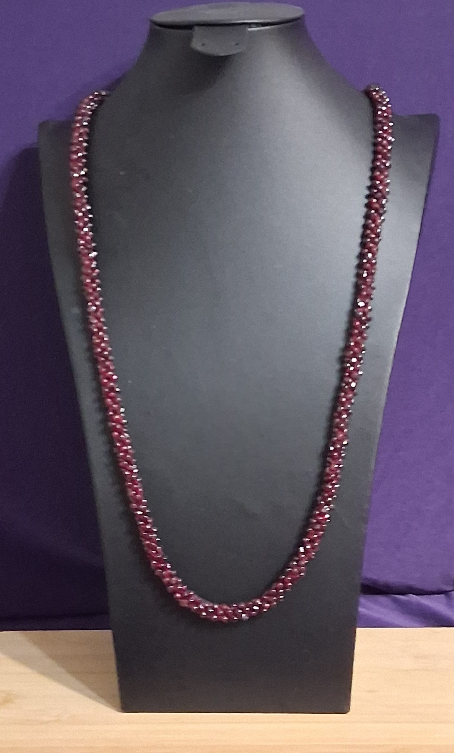 • Materials: Garnet beads, strong cord, kumihimo-style hand-knotting