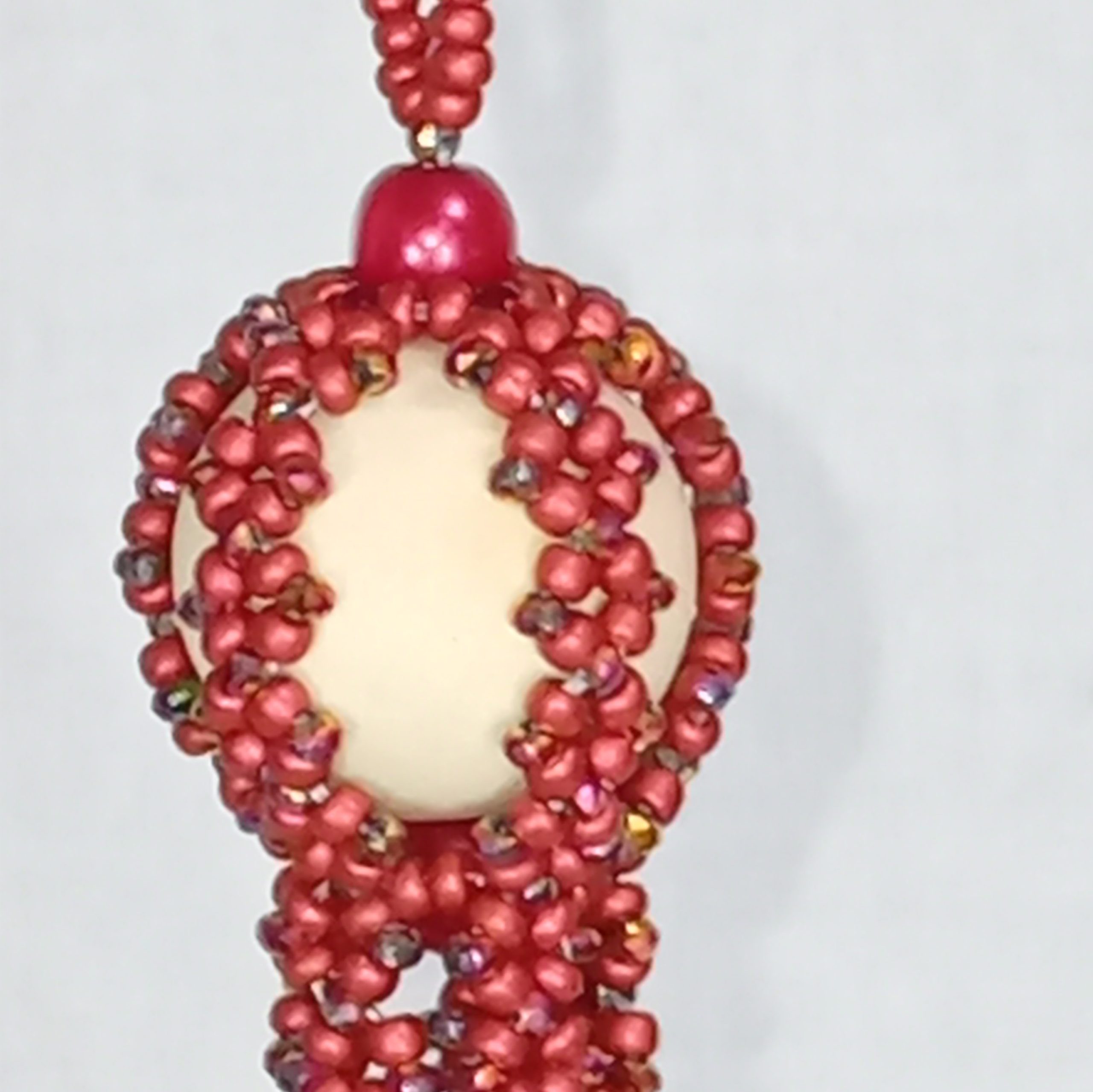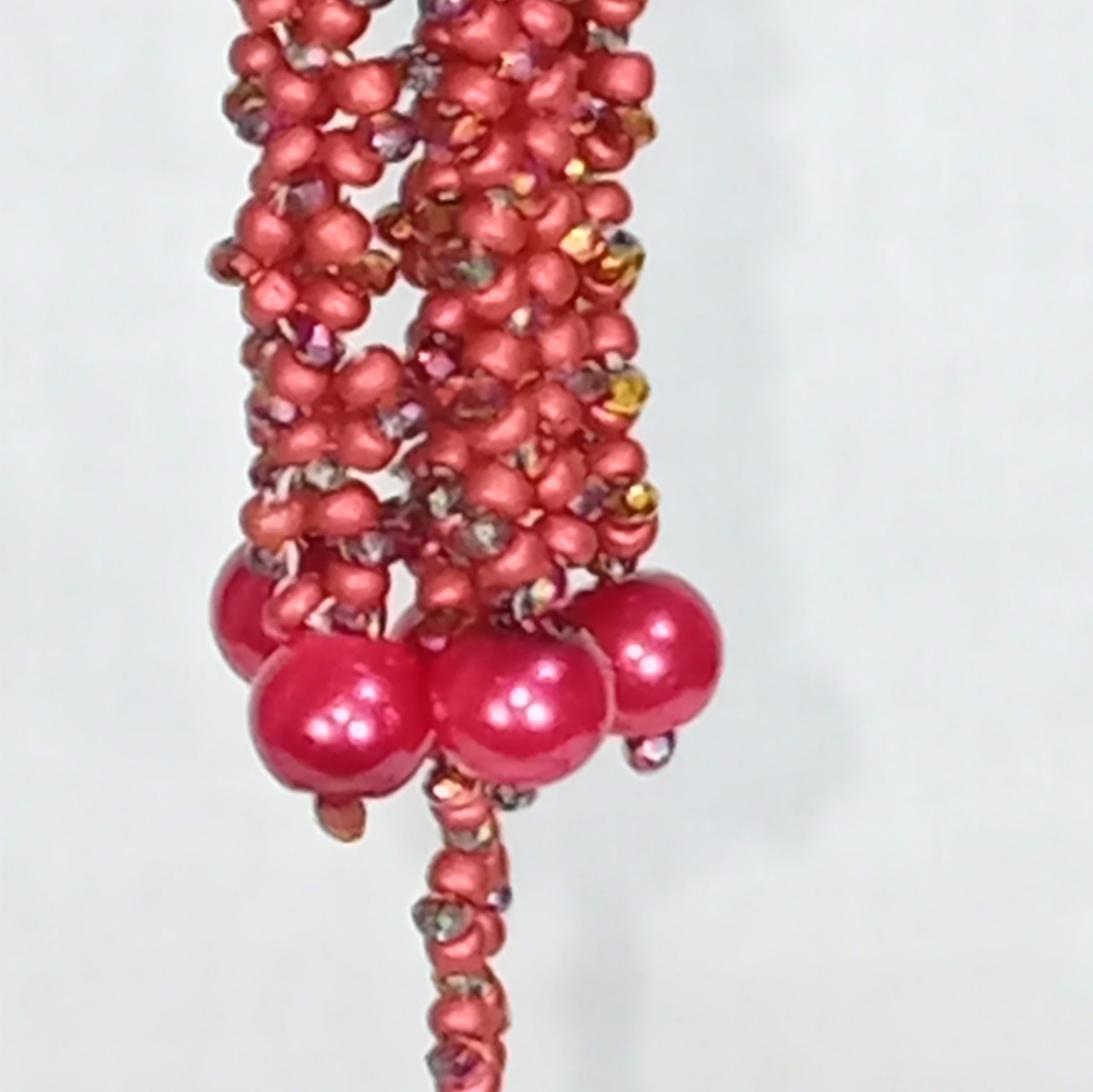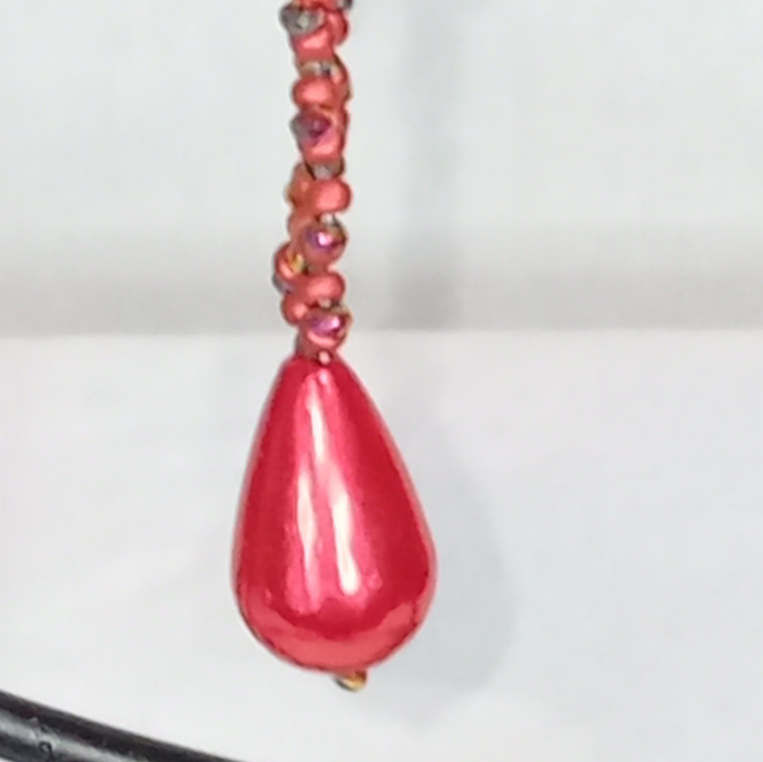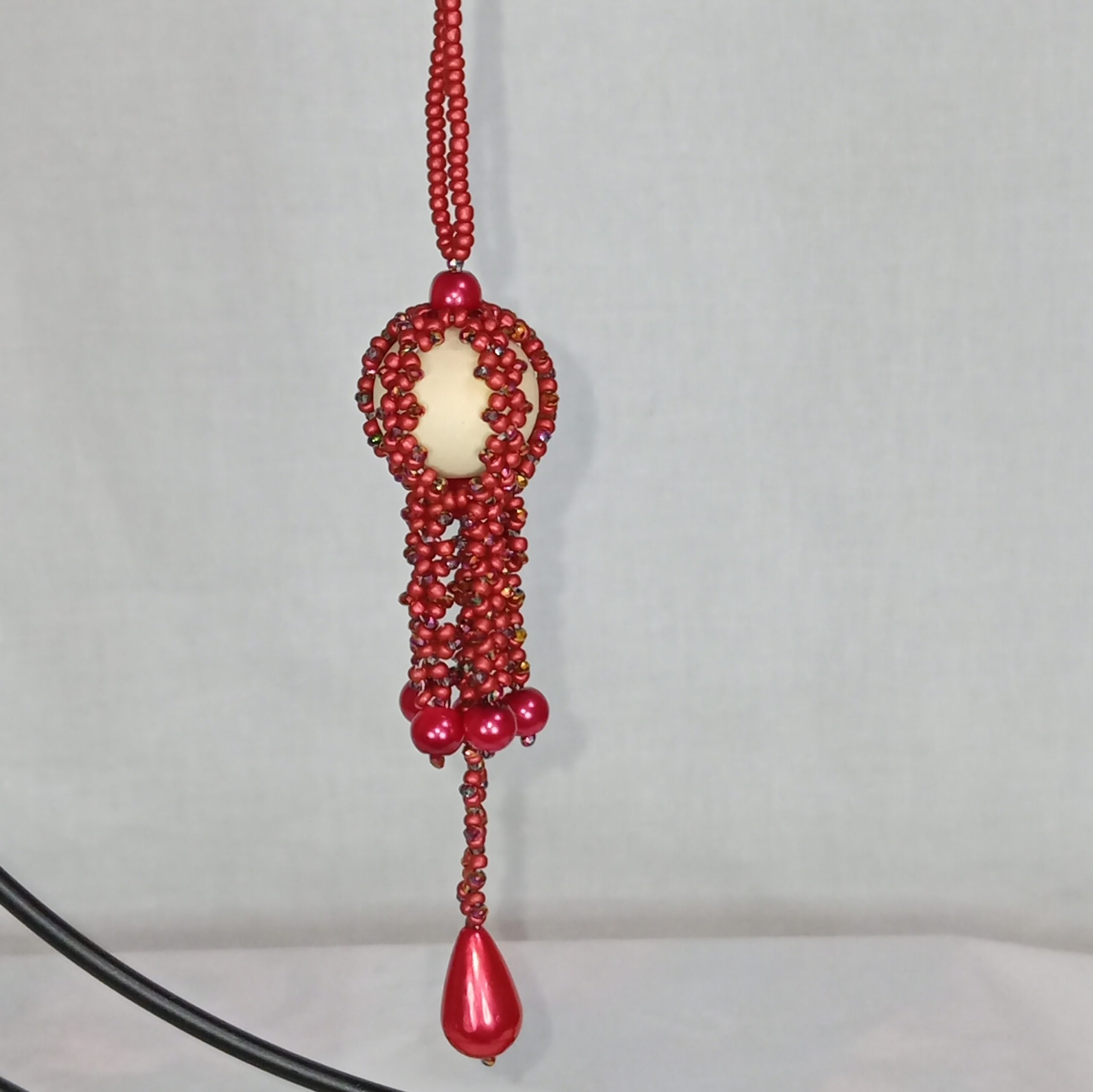 This beaded pendant is all drama and shimmer—featuring a creamy central wooden bead framed in rich reds, with a cascade of tasselled strands that sway as you move. The main dangle measures 2″, but with the loop and full extension, it stretches to a graceful 5″—long enough to make a statement, light enough to wear with ease.