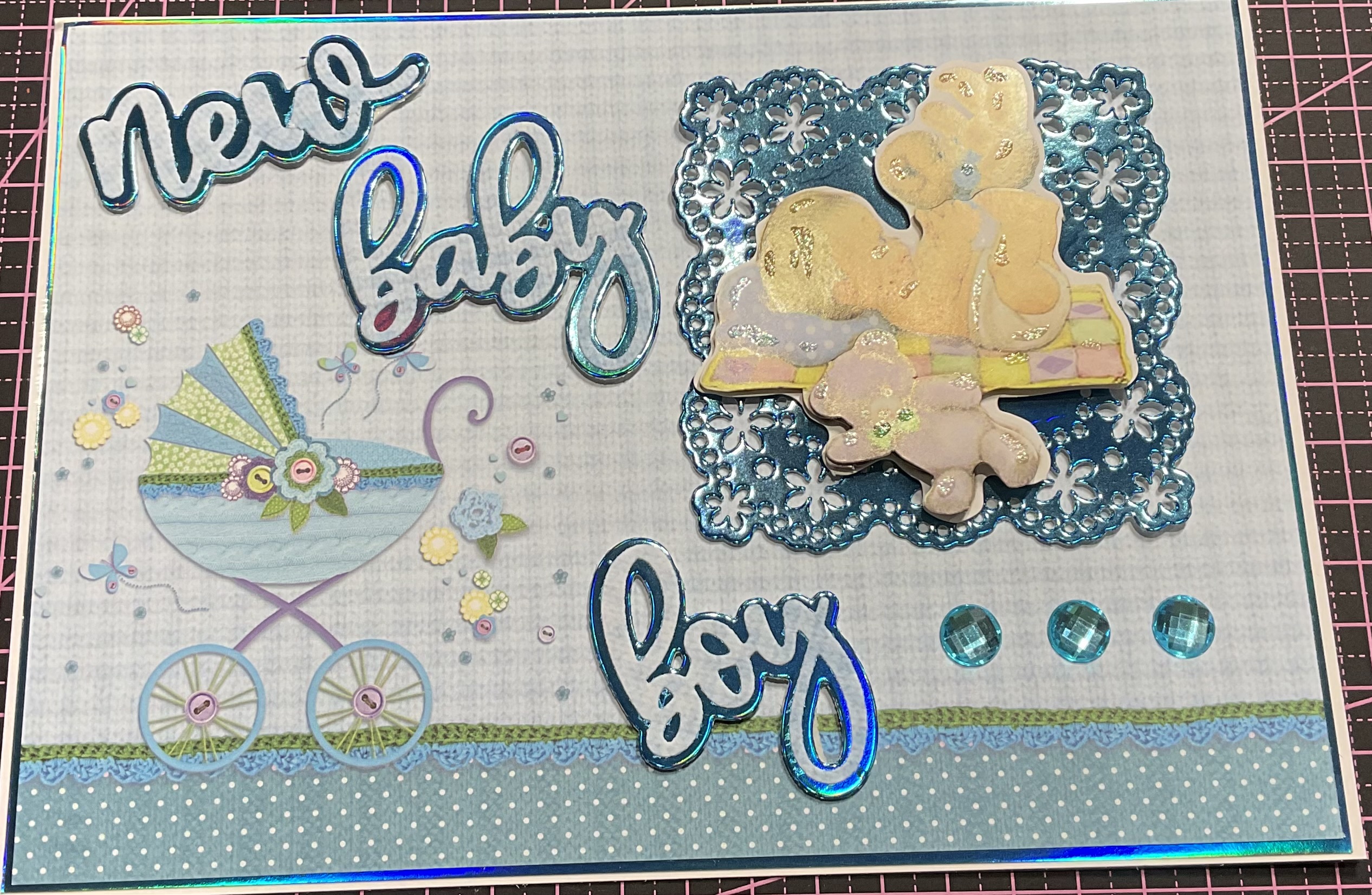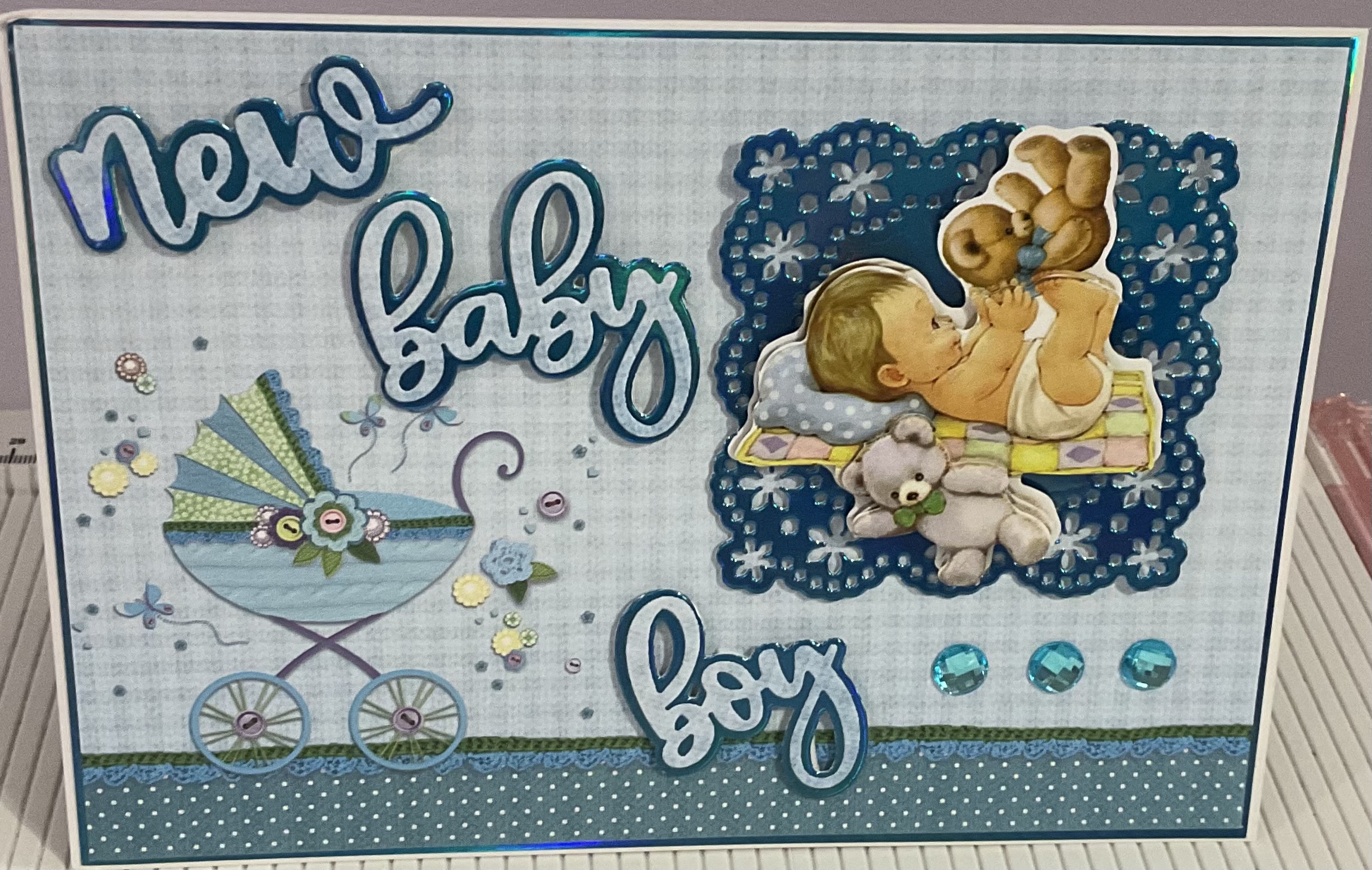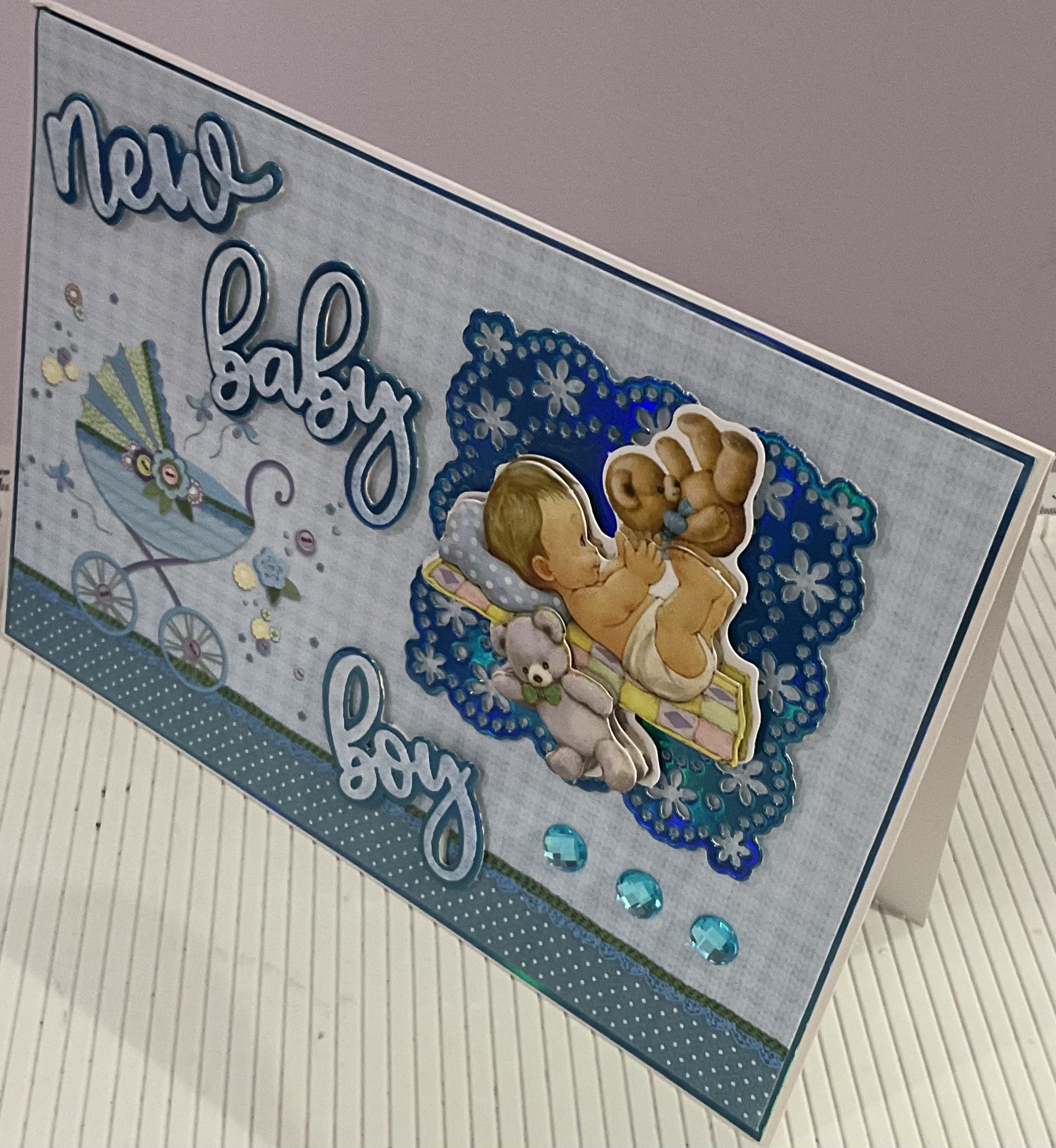 Handmade baby boy card, decoupage detail, tent fold style size, size A5 with envelope and cellophane bag
