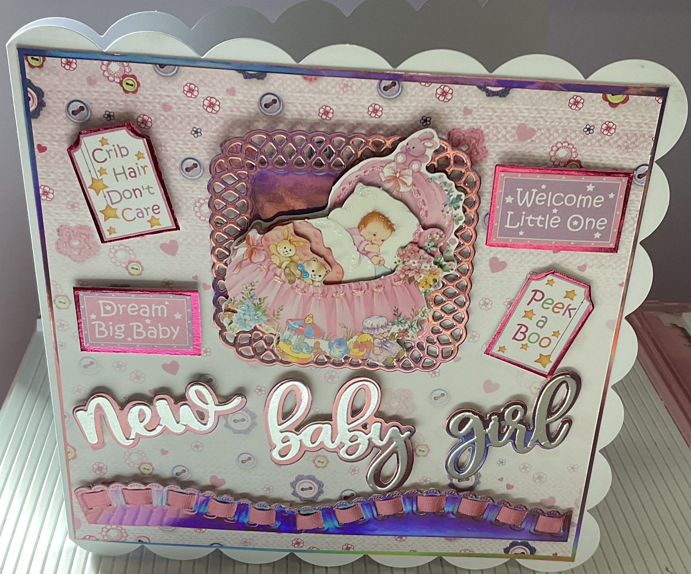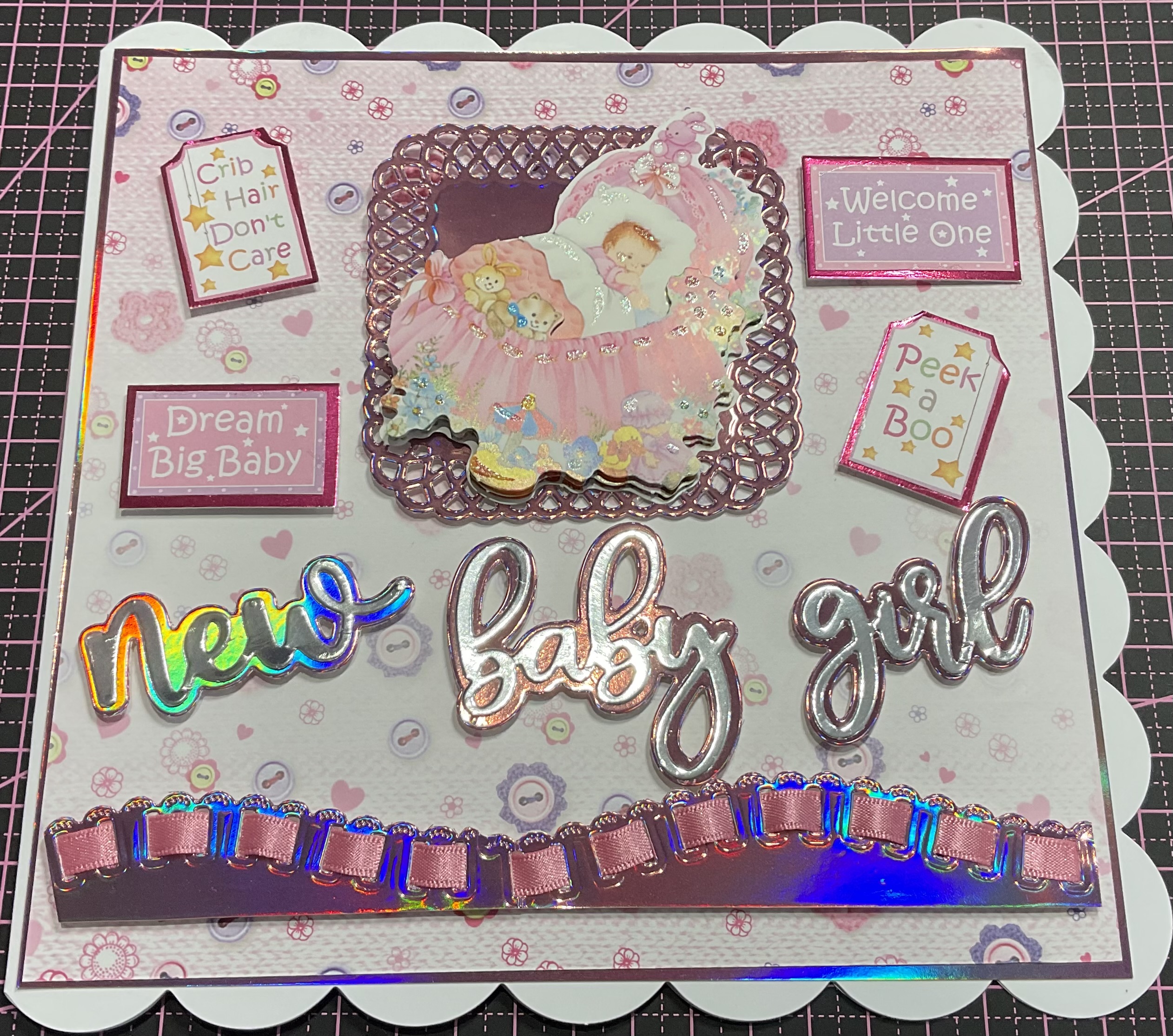 New baby girl card with decoupage and ribbon threading detail, size 8×8 inches with envelope and cellophane bag