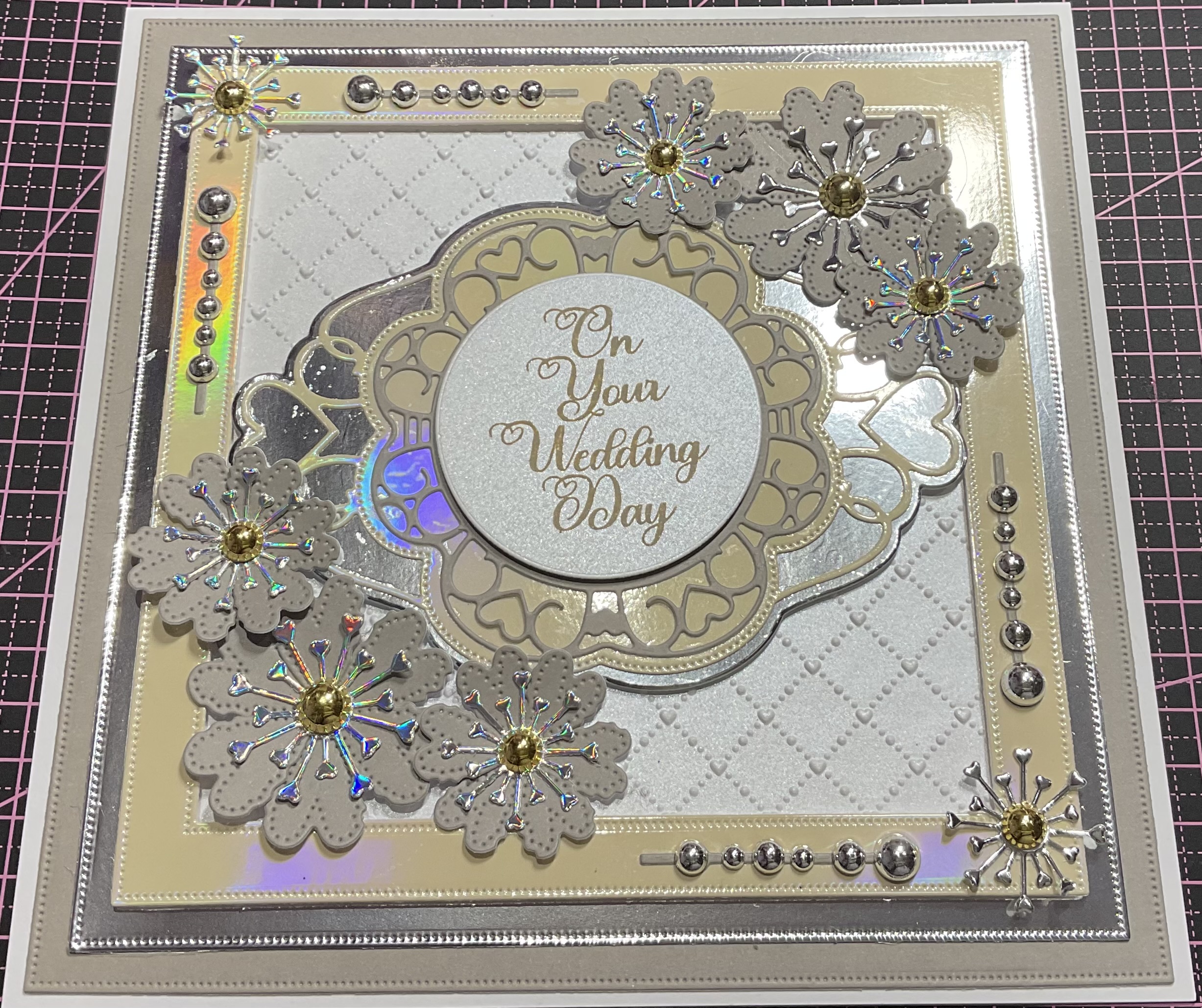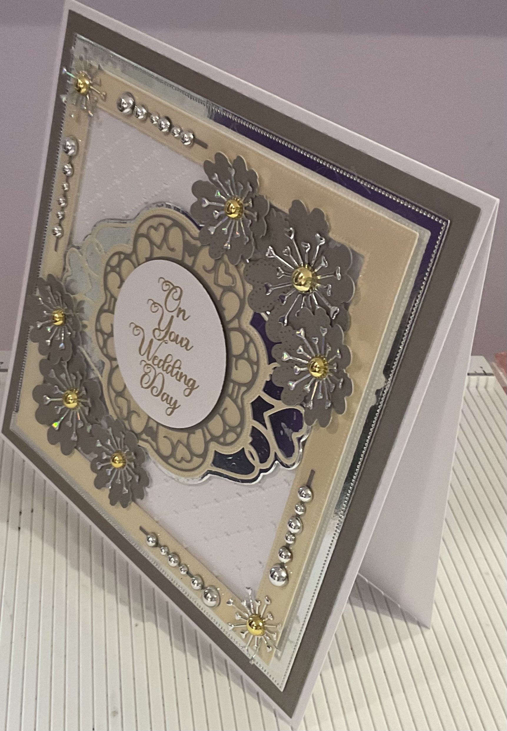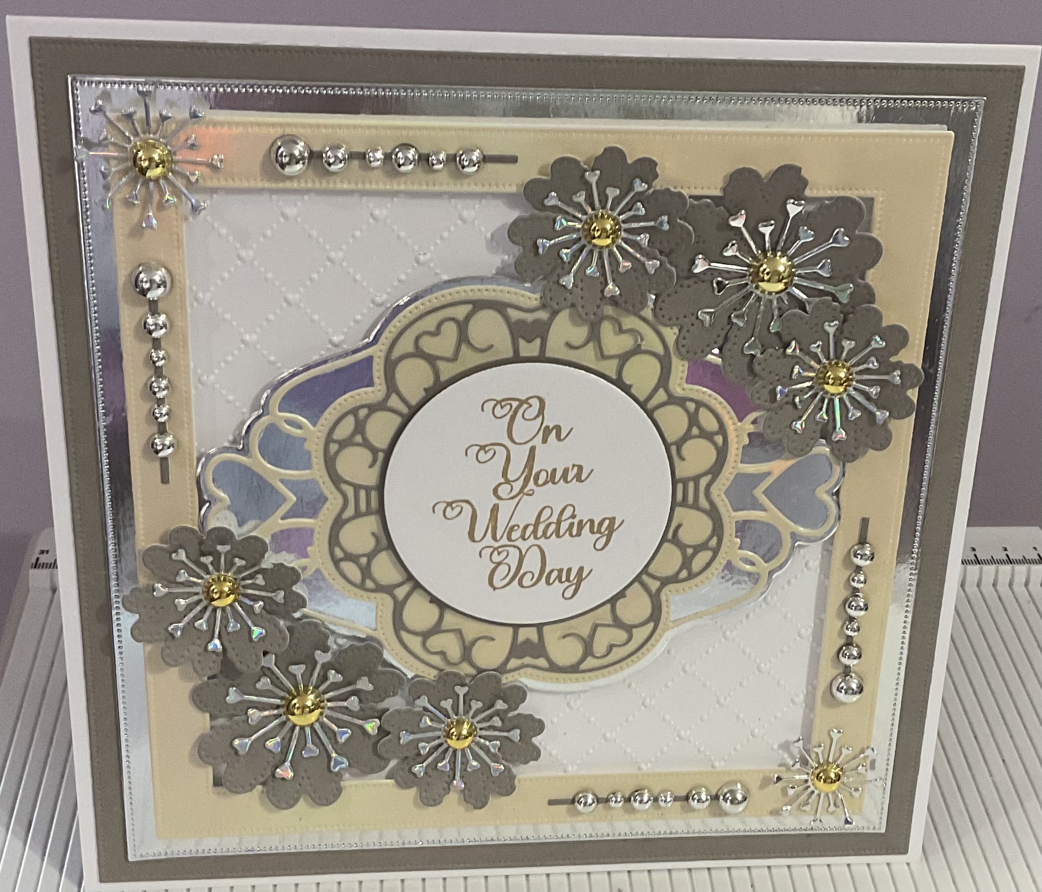 Handmade on your wedding day card, beaded ,flower and embossed detail, colour silver silver , cream and taupe , tent fold style size 8×8 inches with envelope and cellophane bag