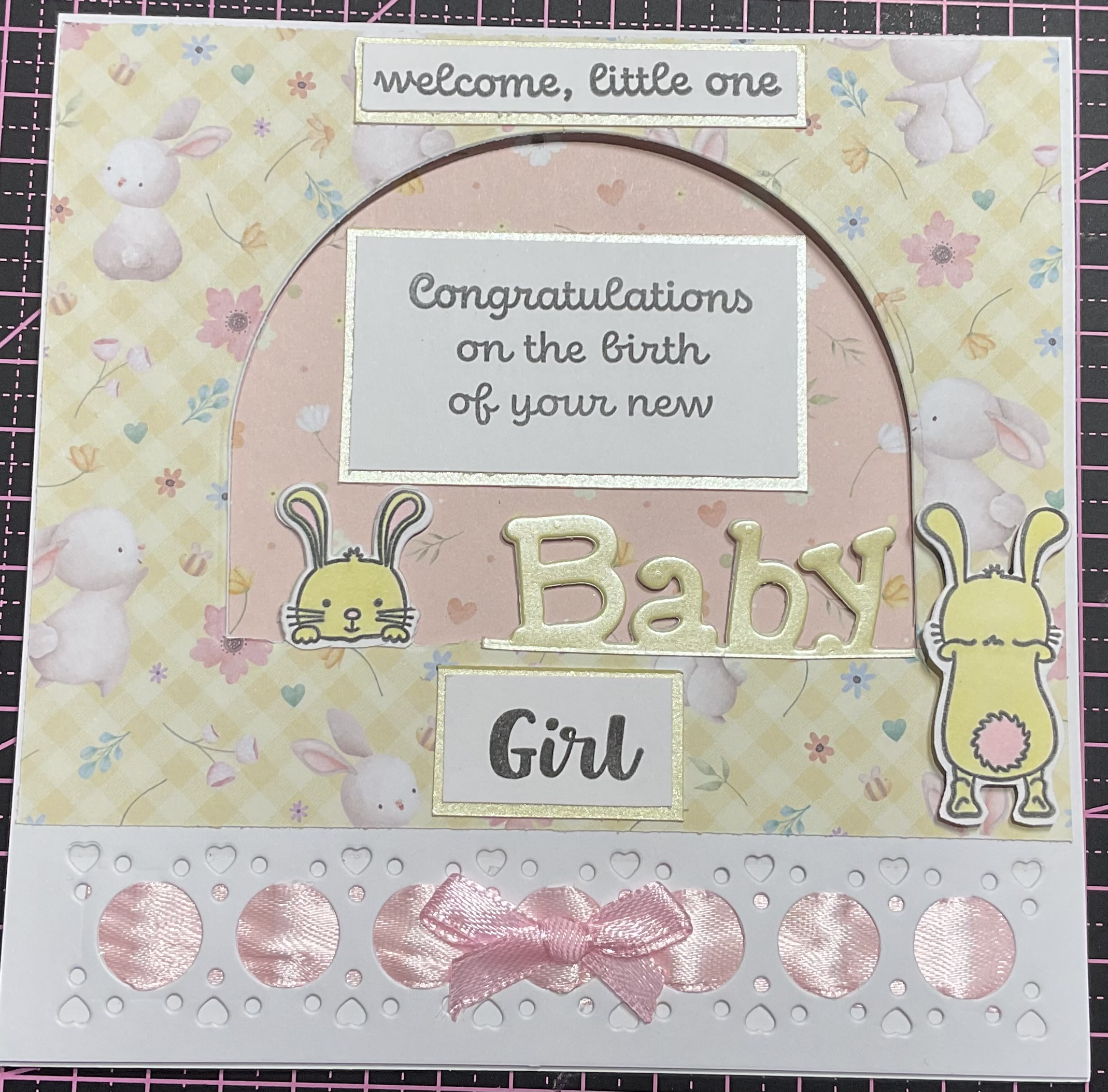 Handmade peekaboo baby girl card very cute, so cute with peeping bunny and ribbon and bow detail, size 6×6 inches with envelope and self seal bag