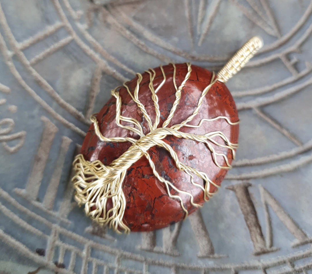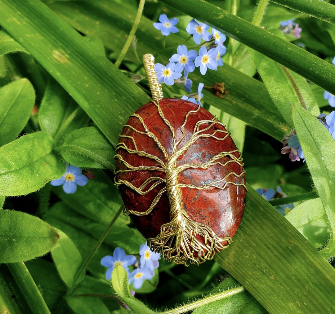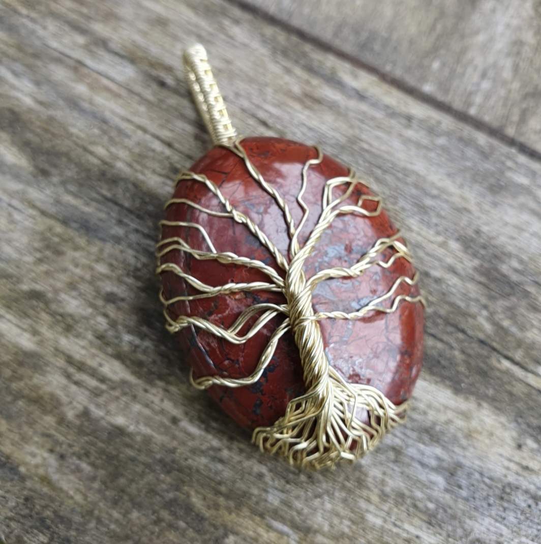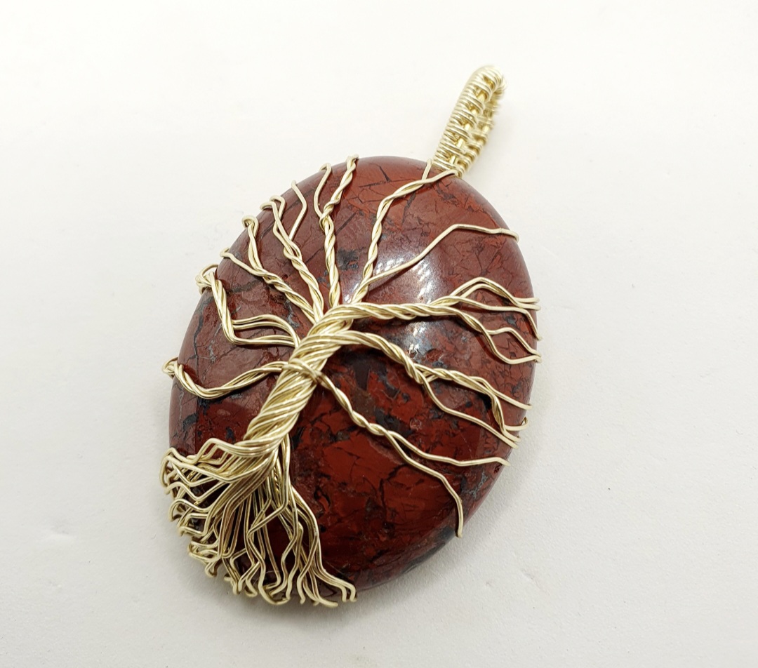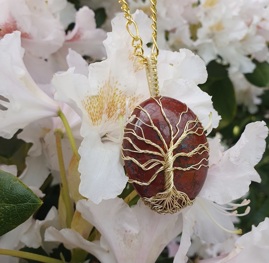 This gorgeous oval shaped Poppy Jasper cabochon is wrapped in a gold plated ‘tree of life’ wire design. This one of a kind pendant measures just under 6cm in length and approximately 3cm wide.