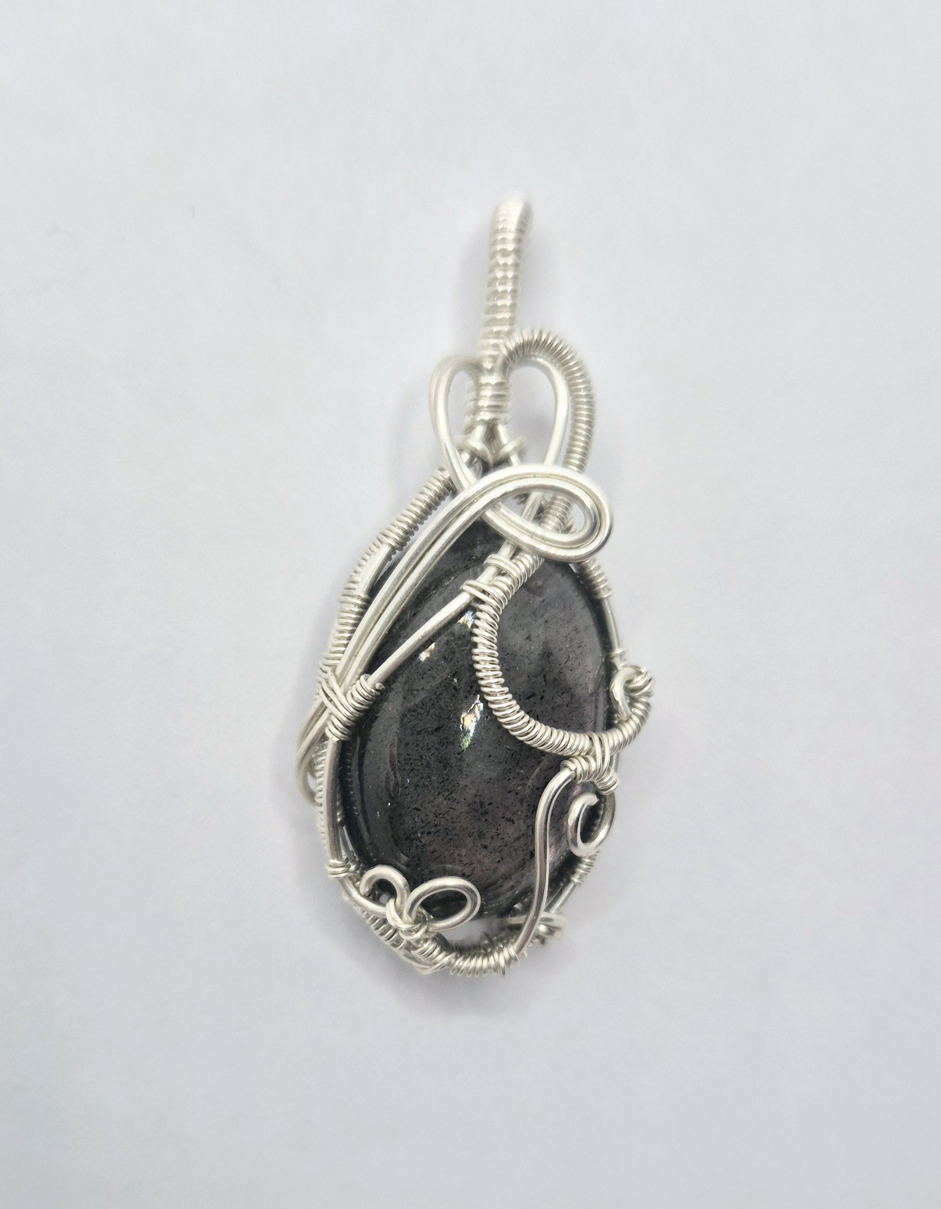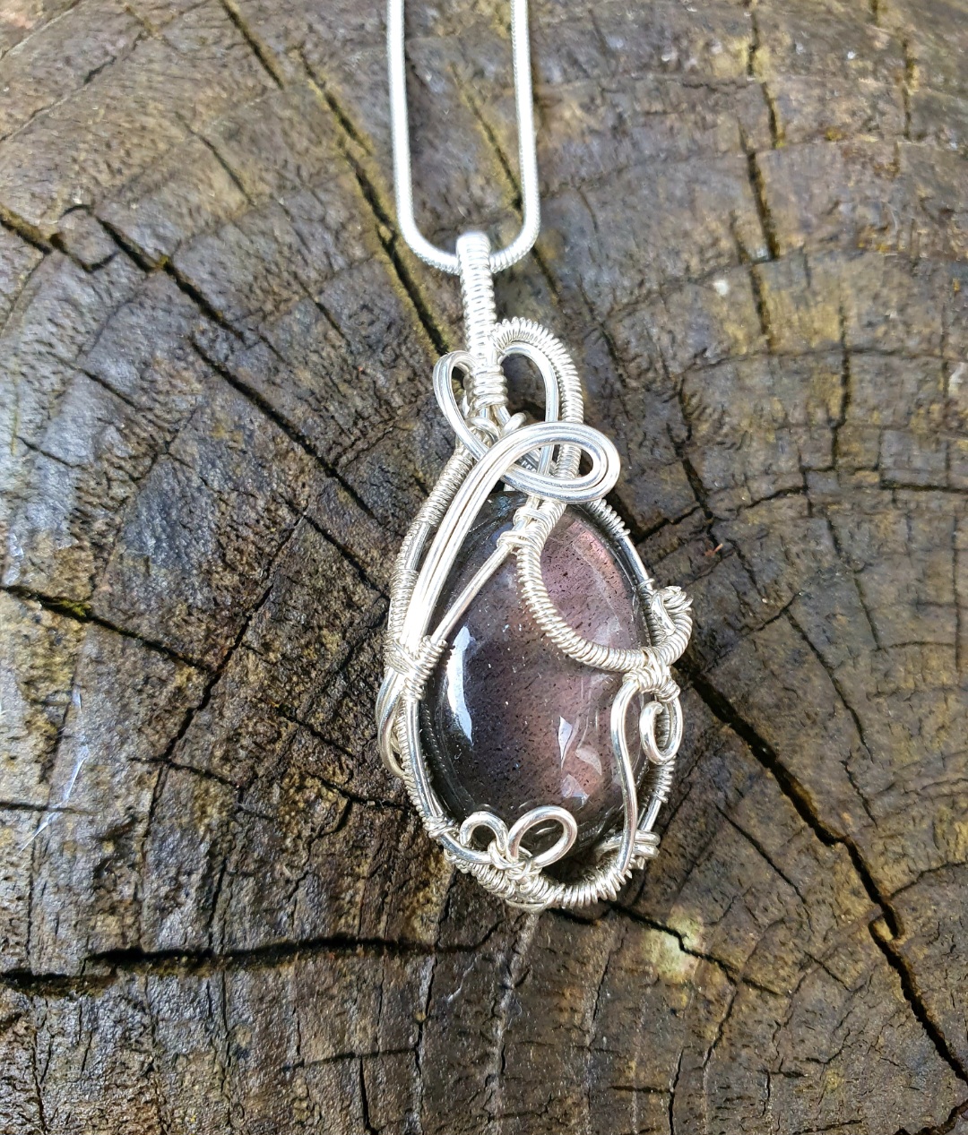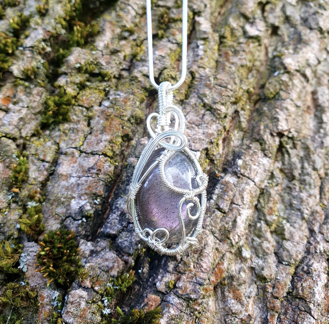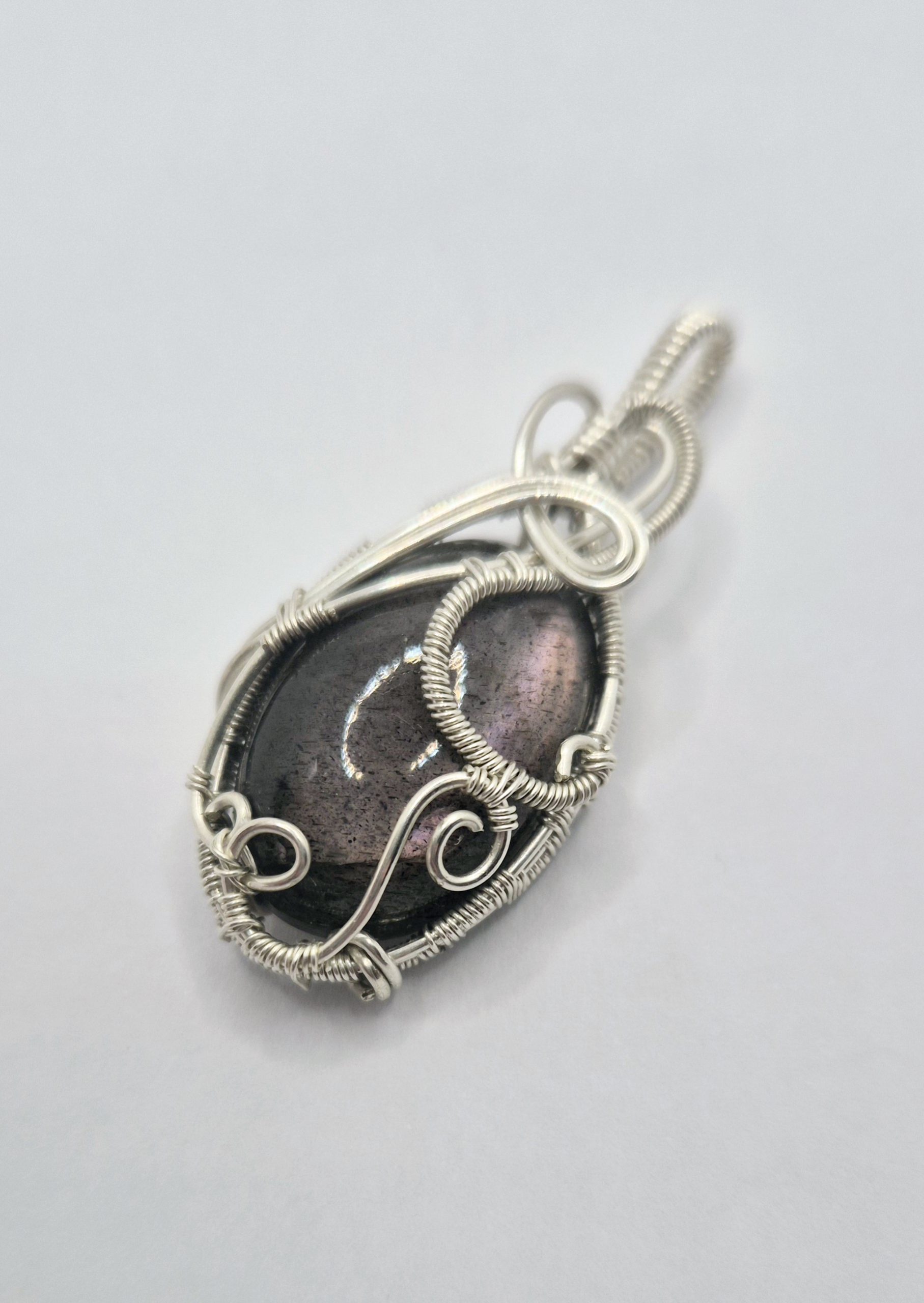 This deep purple Labradorite, encased in sterling silver swirling wire is a unique one of a kind piece.