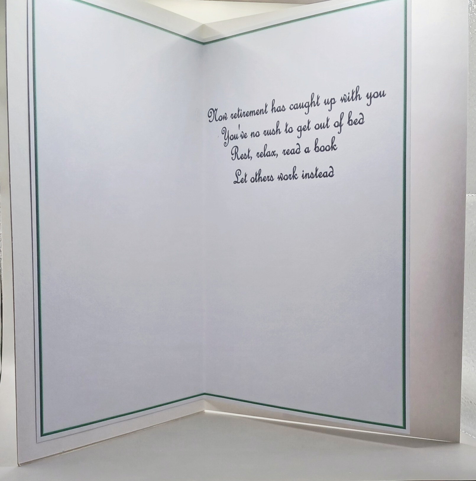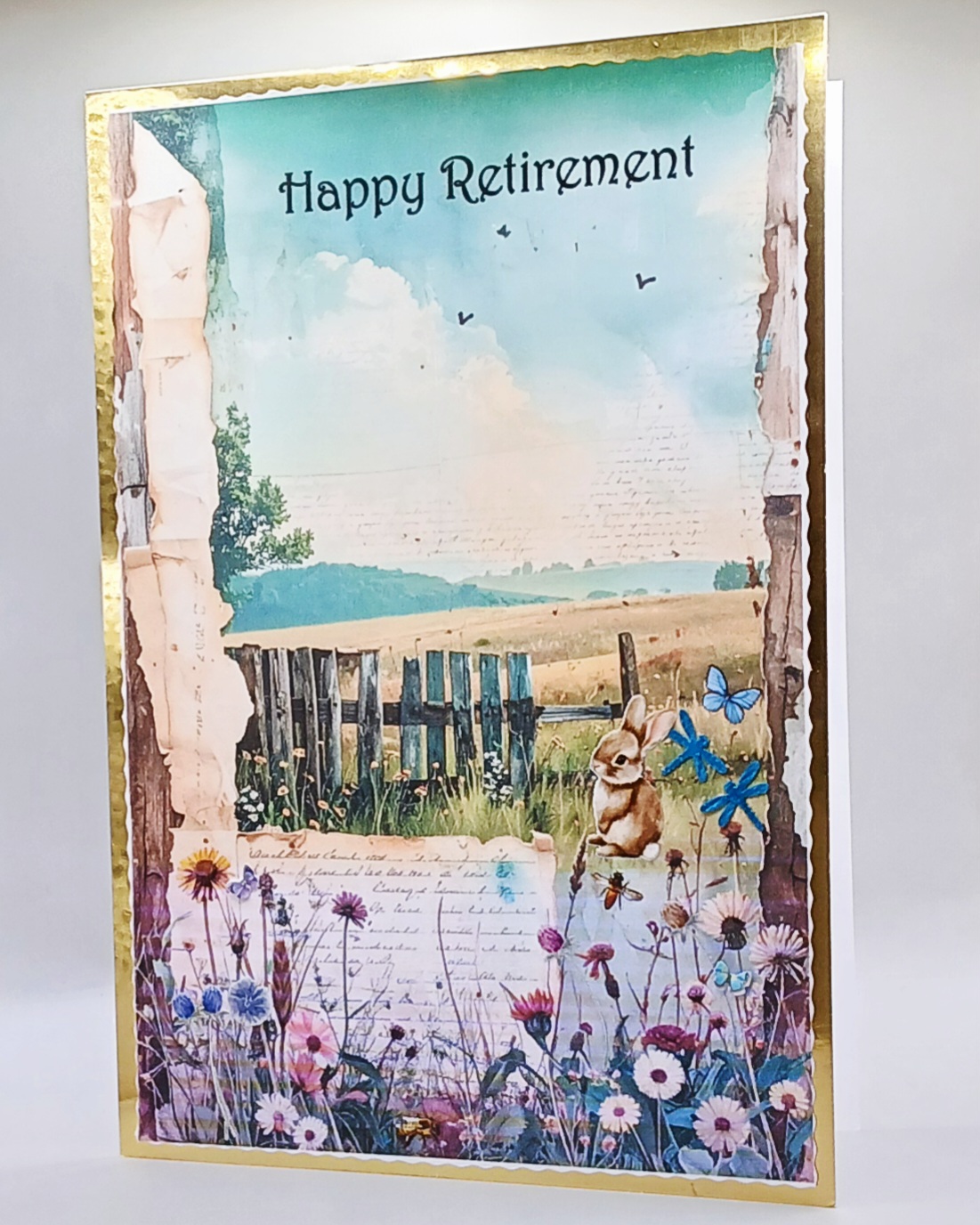 A 21 x 14.5 cm Retirement card, suitable for male or female, embellished with glossy decals. comes complete with an envelope and cello bag for protection. P and P included in the price.