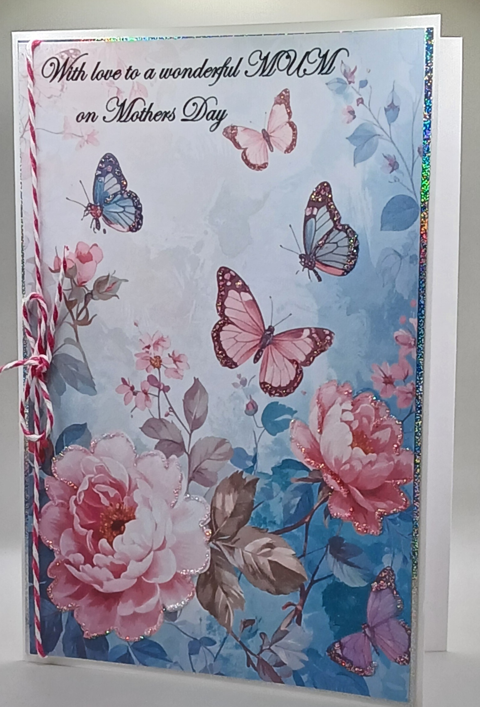 Mothers day card measuring 21 x 14.5 cm. Highlighted by glitter it is a pretty card. comes with an envelope and a cello bag for protection. P and P is included in the price.