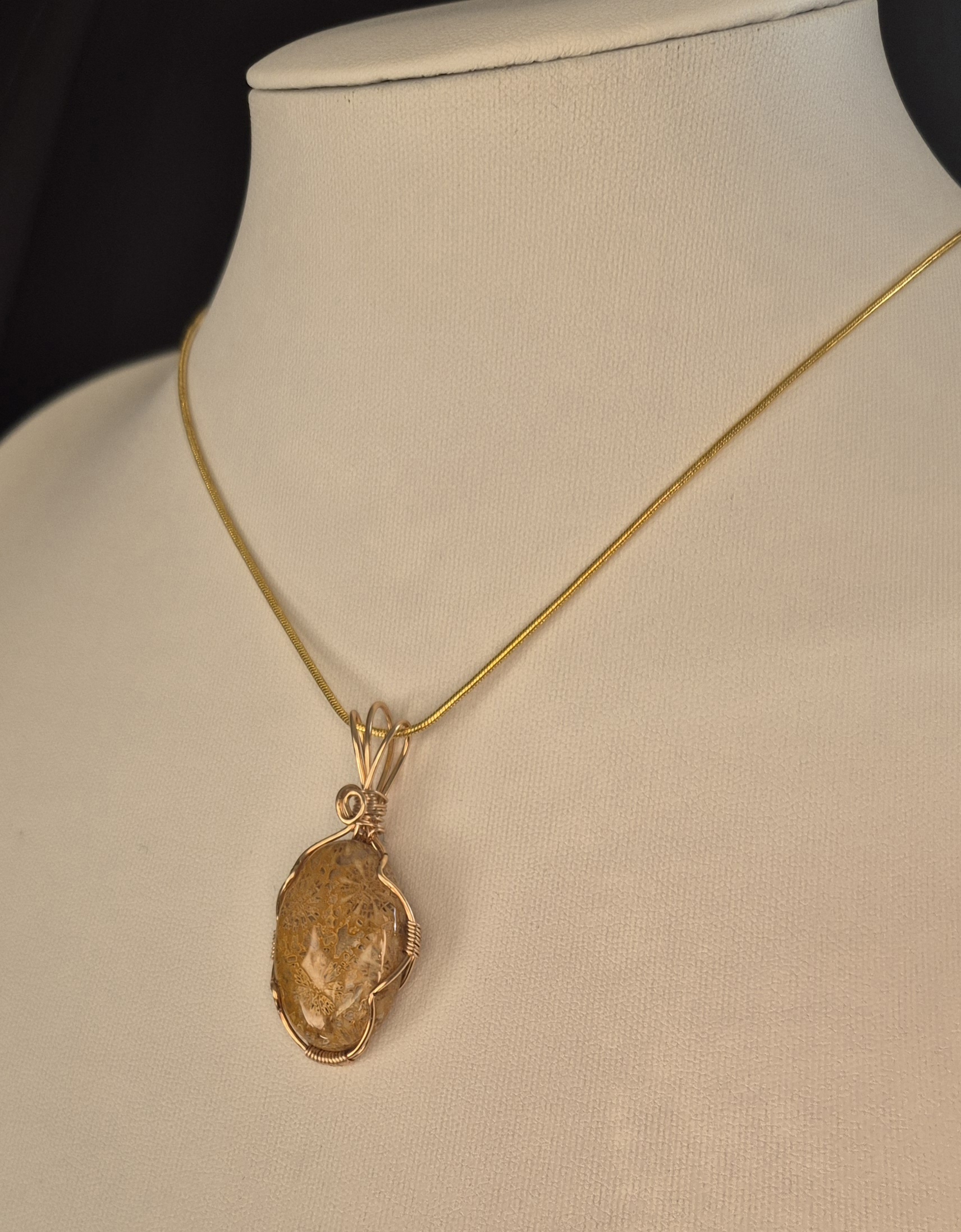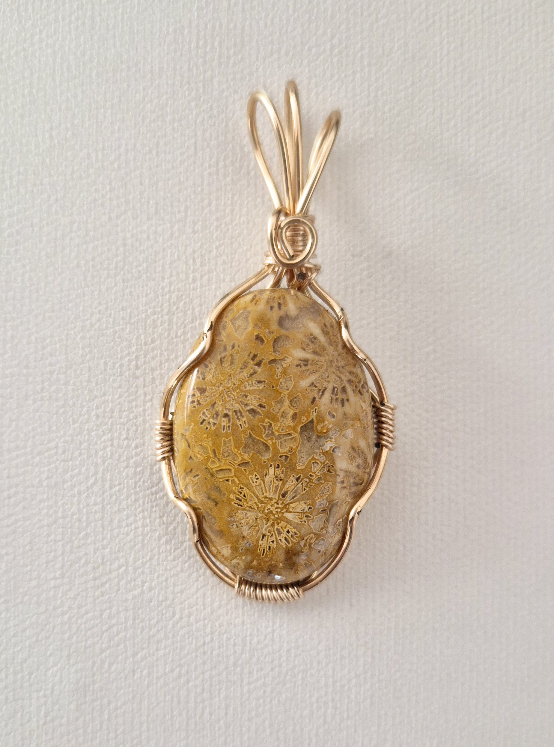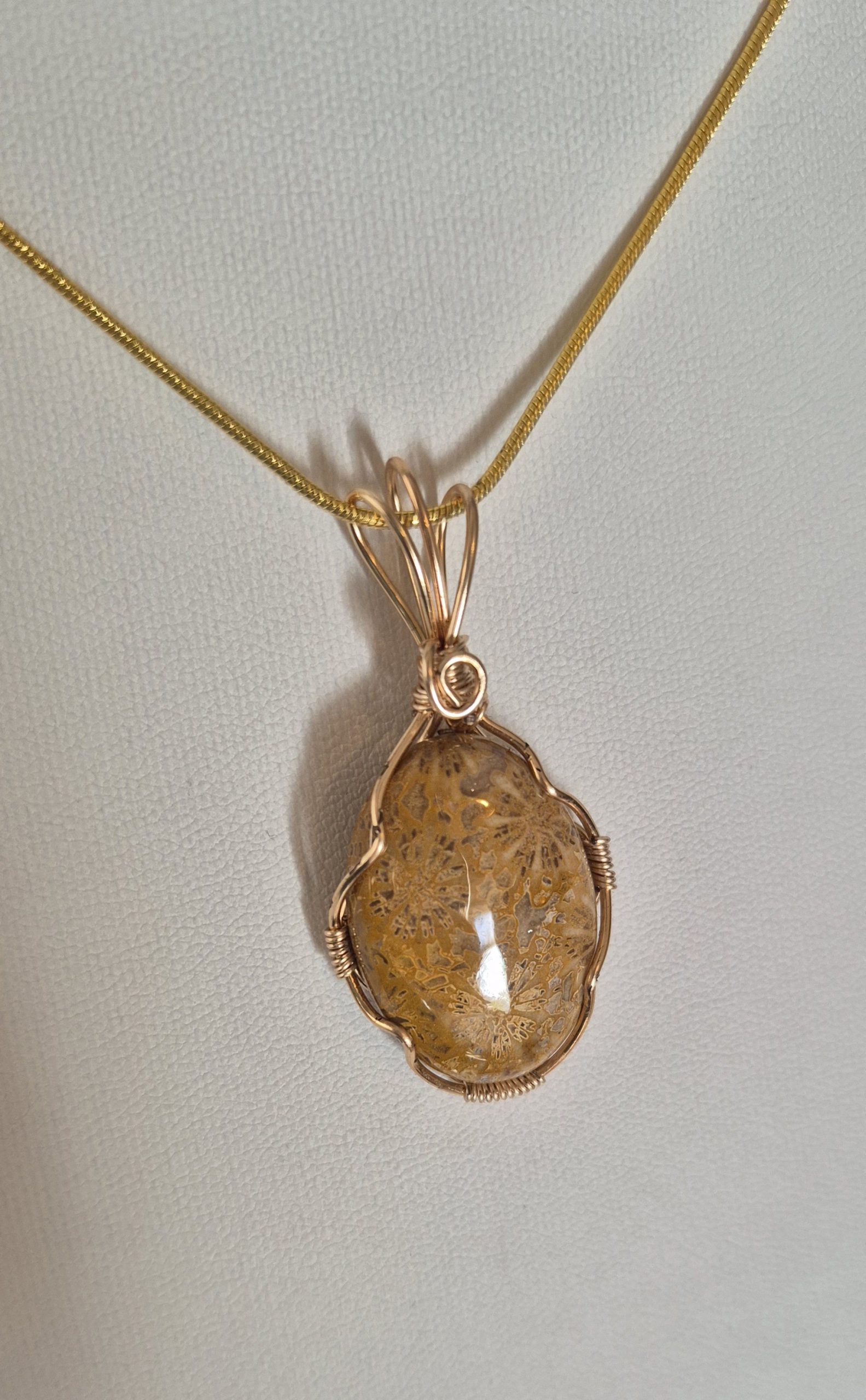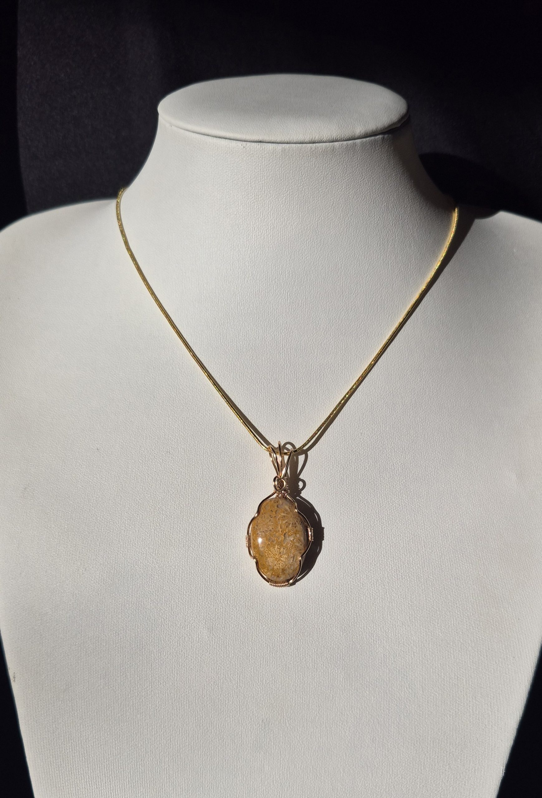 This Star Coral fossil is wrapped in gold plated wire. Unique and one of a kind, this pendant measures approximately 4.5cm in length and 2cm wide.