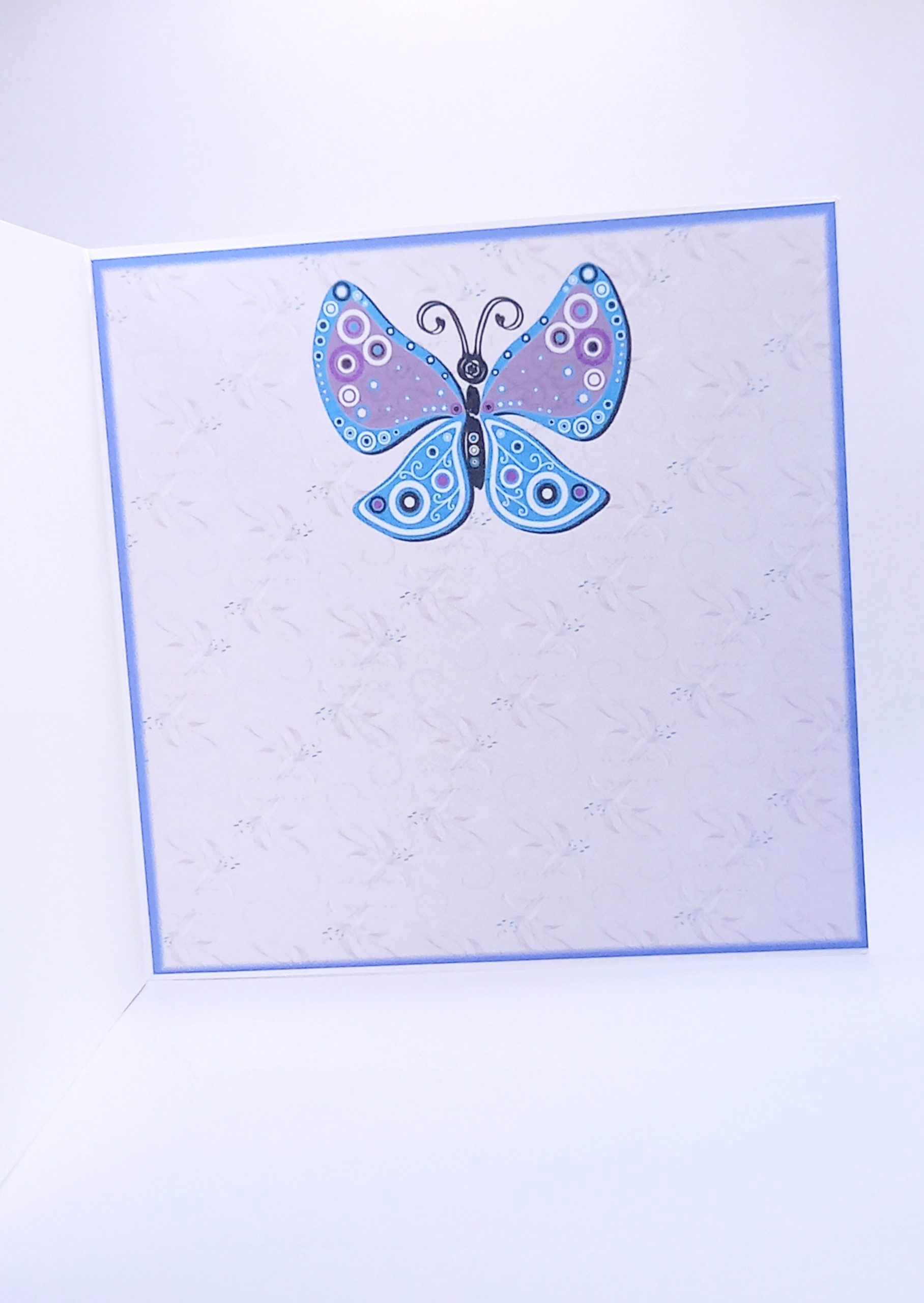 A 15cm x 15cm Thank you card, featuring 2 butterflies, it has a matching insert also, made from top quality materials, designed and printed by myself, this card comes complete with an envelope and cello bag for protection. P & P included in the price.