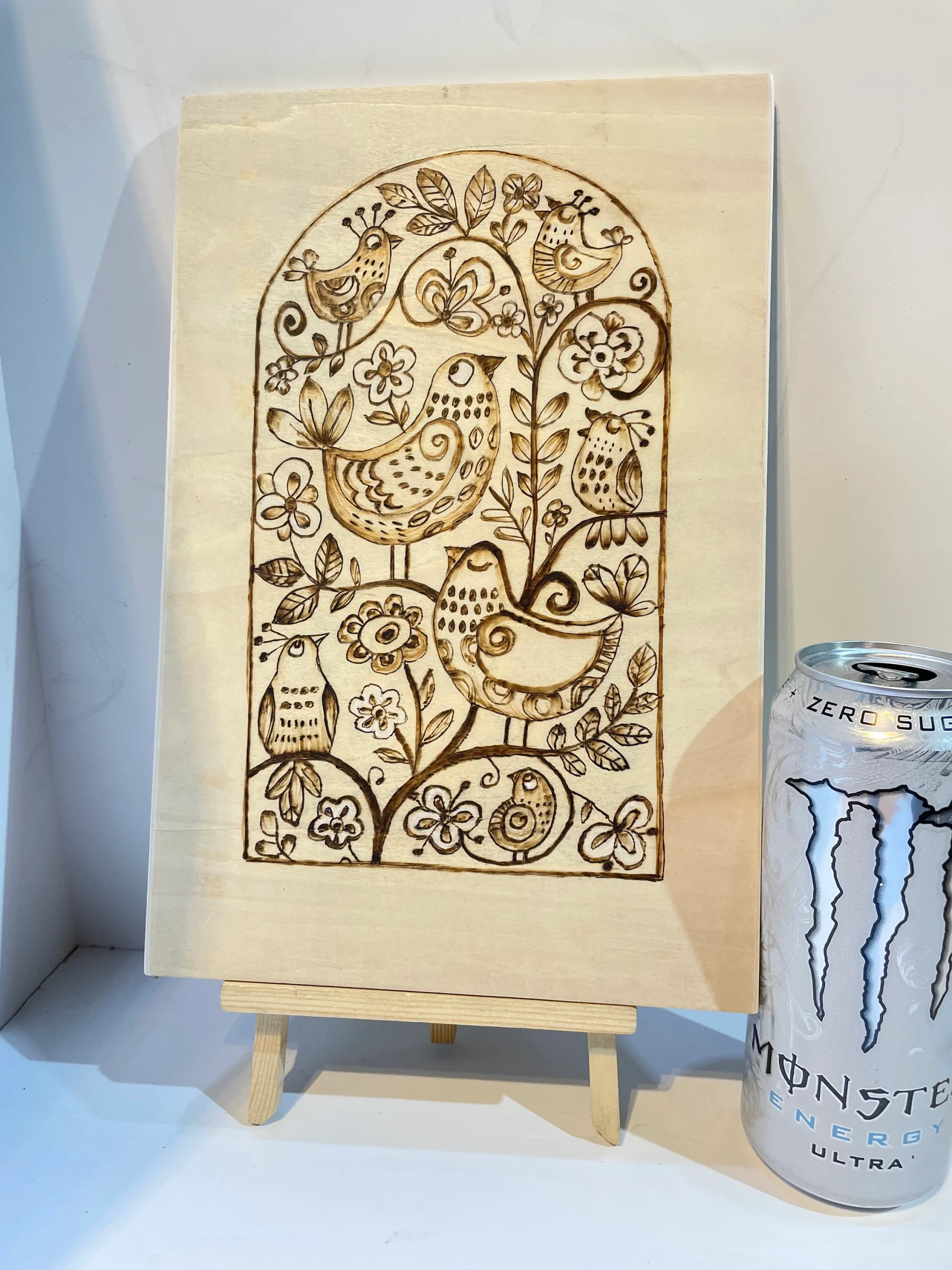 The Birds (Stylized) in Pyrography on Plywood. Fitted wall hanger. Made in Nottingham, UK