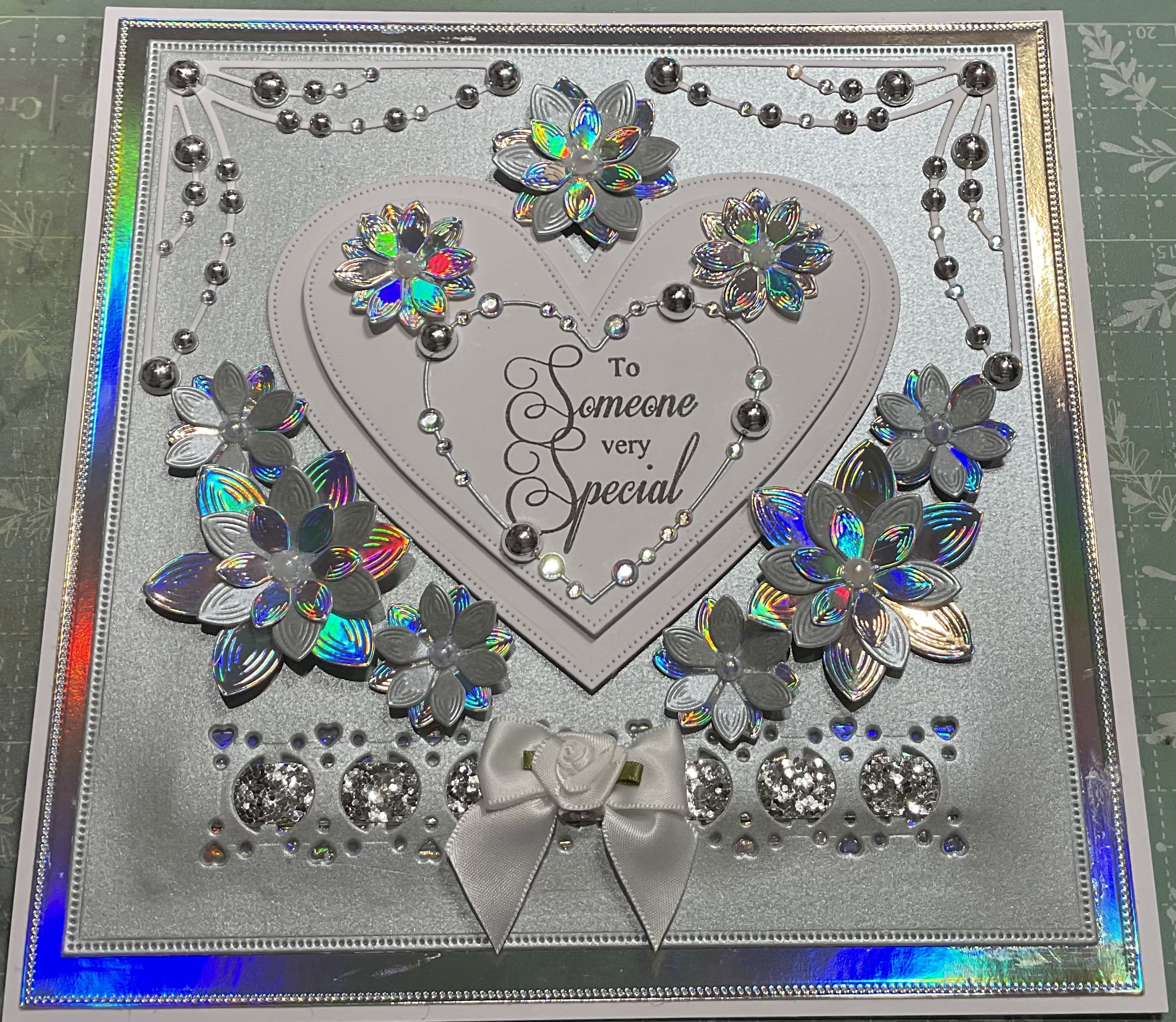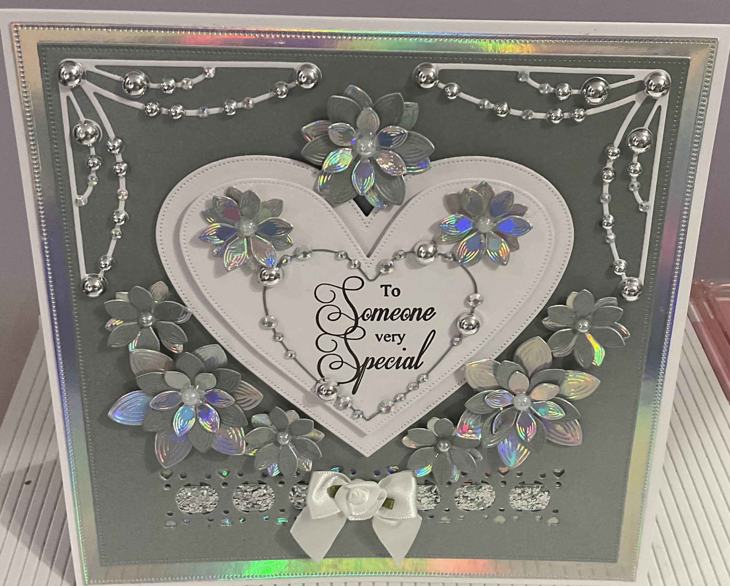 Beautiful handmade beaded card with flowers and bow detailing, tent fold card, colour silver and white, size8x8 inches with envelope and cellophane bag