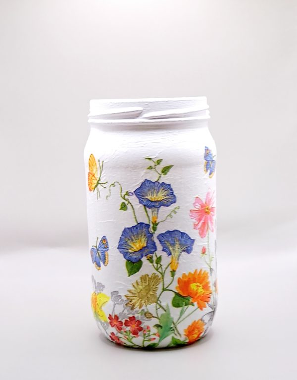 A really pretty glass jar, painted white with acrylic paint and decoupaged with a napkin and sealed to make it tough on the outside, can be used for a number of things in the home, especially as a vase, but do not immerse in water, wipe the outside clean, can be used as an ornament or a container in the kitchen, office, or craft items. P&P is included in the price.