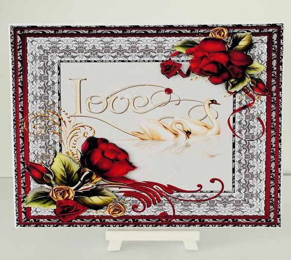 I have printed the design on 240 gsm super smooth pro paper card and used an 8×8 square white card blank, 240 gsm. I have left a white border and cut the roses out on the design and 3d decoupaged with glue gel. Such a beautiful design. An insert sheet can be added if you would like your own personal message and a personalised sentiment on the front, upon request.
