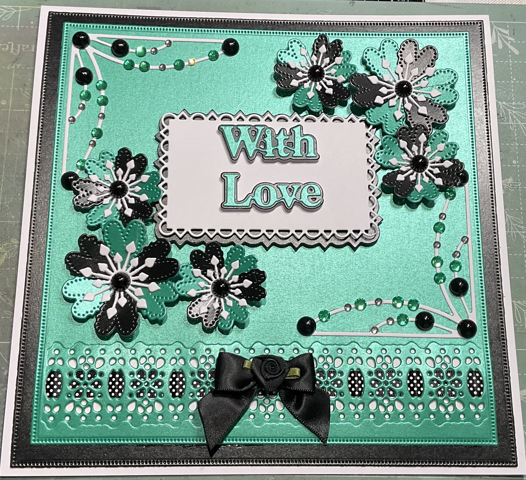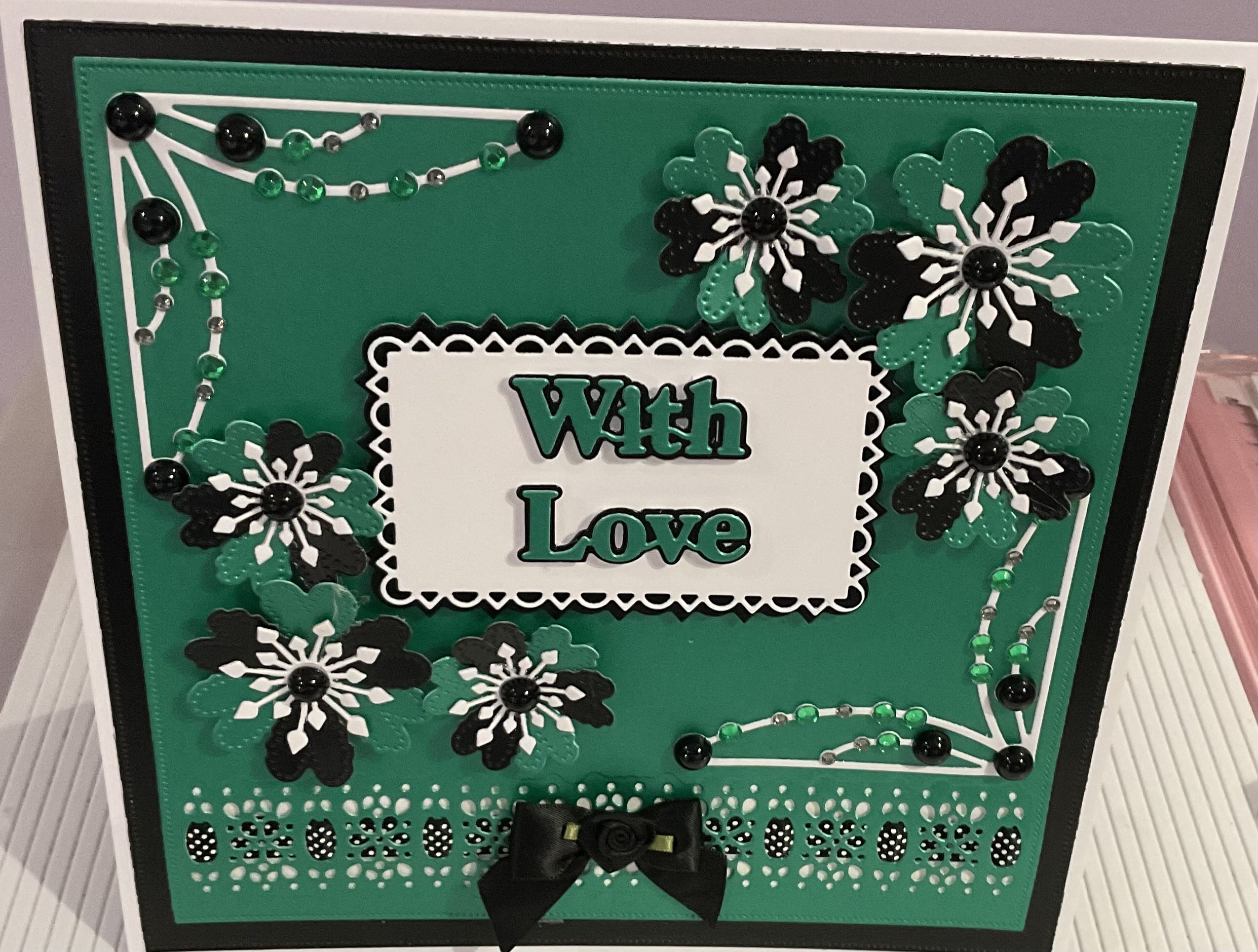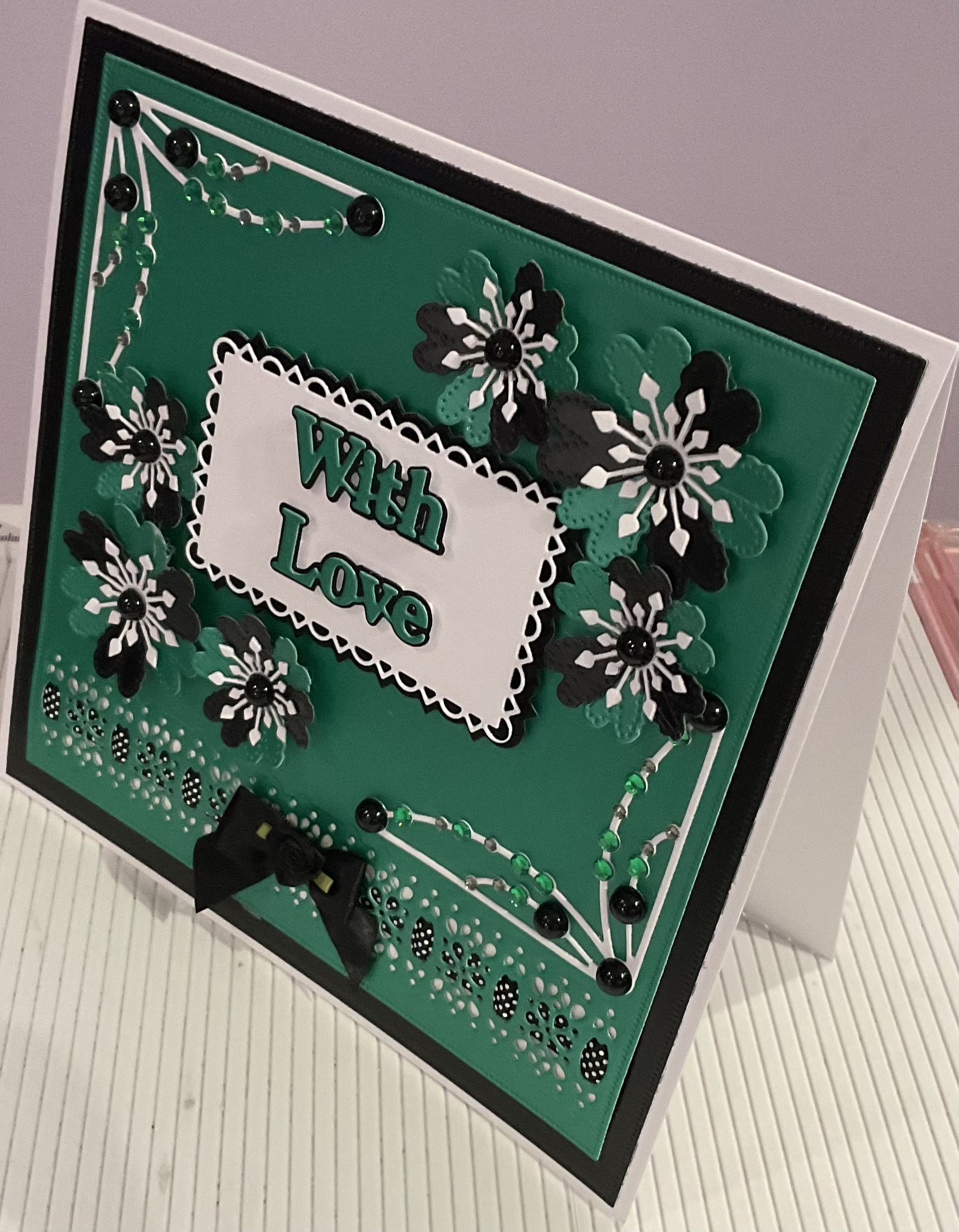 Beautiful handmade beaded card with flowers and bow, tent fold card, colour green and black and white, size 8×8 inches with envelope and cellophane bag